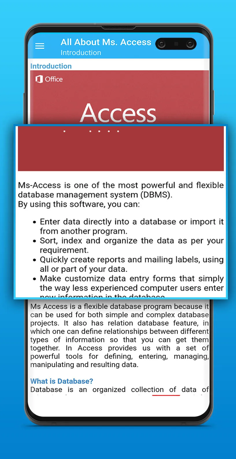 MS Access full version tutorial is introduced by us, for beginners as well as an expert to help you learn how you can use MS Access (database software) presented by Microsoft corporation. We have explained every tool in simple English with images. MS Access is one of the most powerful and flexible database management system (DBMS). Microsoft Access is an information management tool that helps you to store information for reference, reporting, and analysis. This app is all about ms access, you will learn Data organization. Table, Queries, Forms, Reports, Pages, Macros, Modules. Ms-access course will guide you from basic opening MS Access to Logical Formulas. Everything is explained step by step, which makes it easy to understand. ...