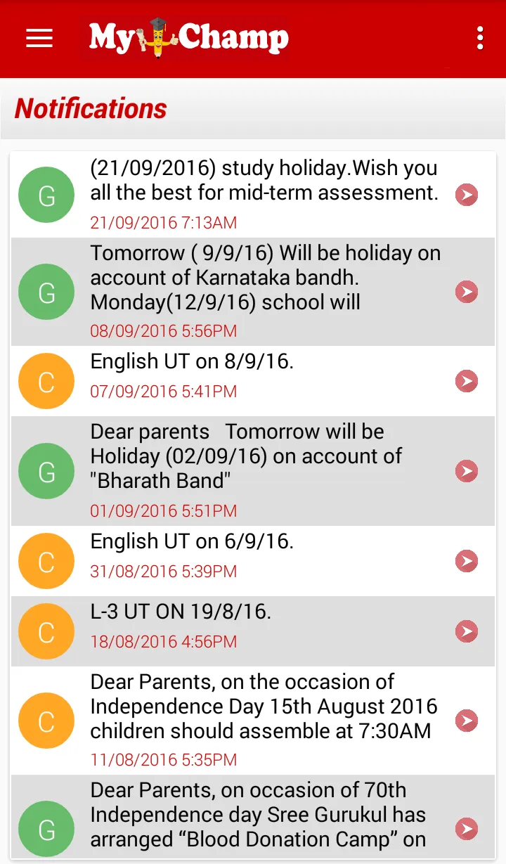 MyChamp Apps is built for parents/students of the institutions who have subscribed with PLV. Using MyChamp Apps you can get various information related to academics, schedules, fees etc., of the registered students. This is a simple App for keeping track of your children's activities at there schools/collages. You will find this to be an invaluable tool. Features: You will be able to get the following info; ...