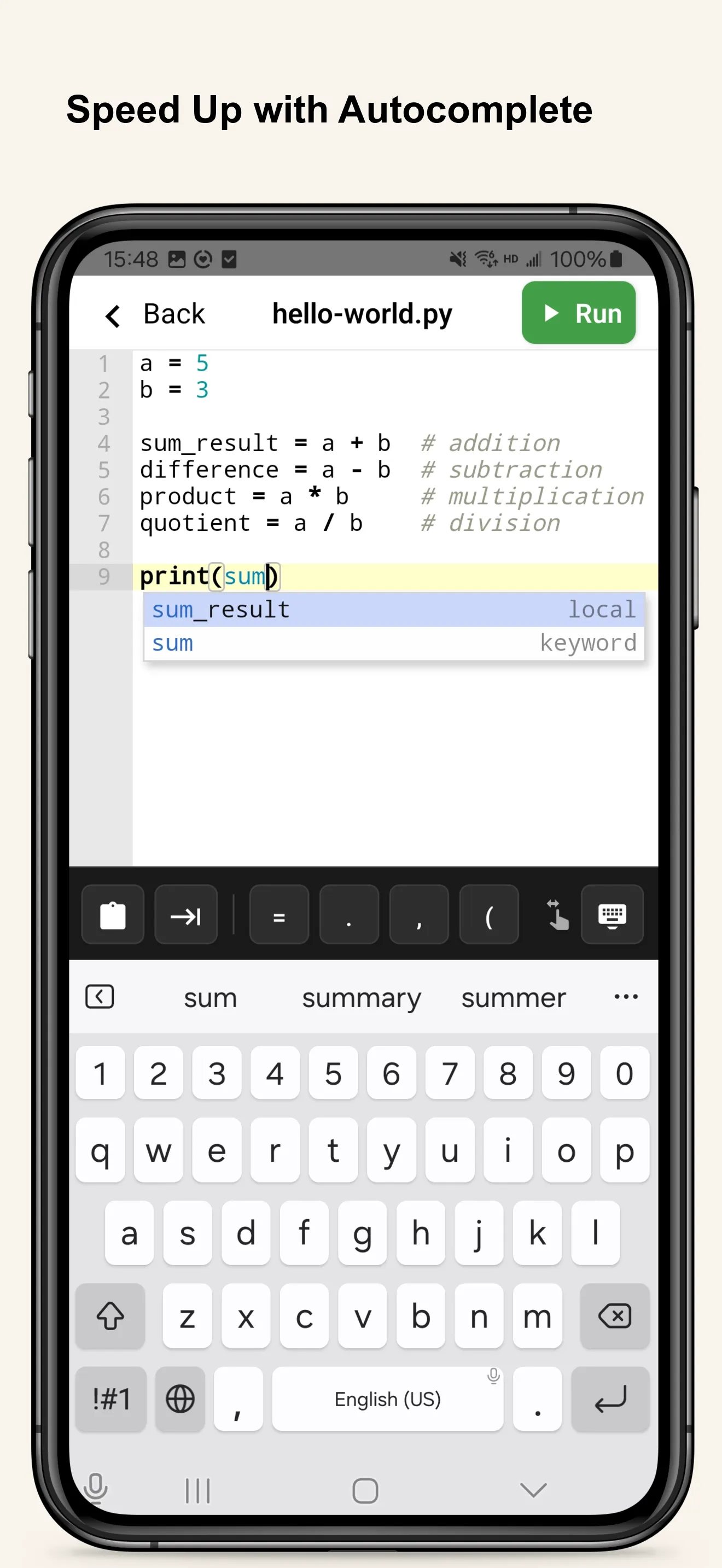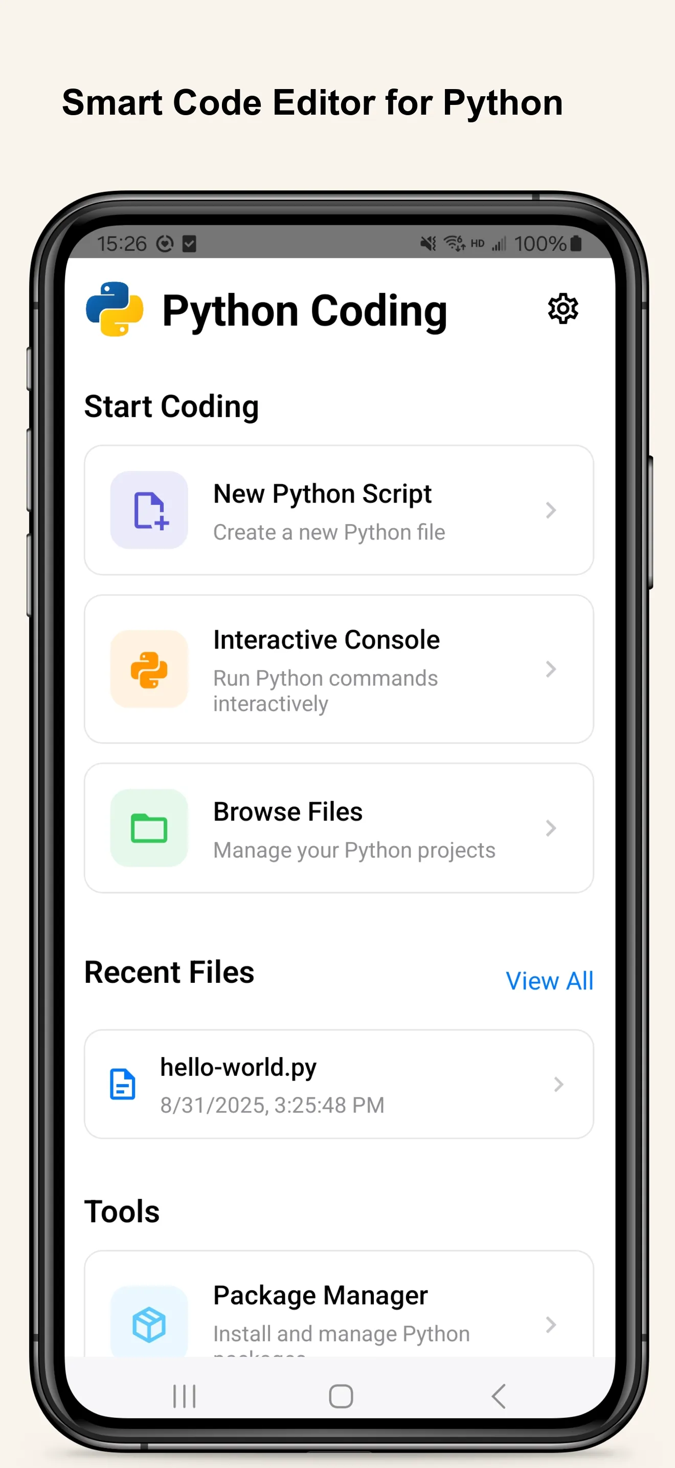 Python Coding – Code Python Anytime, Anywhere Master Python coding on your Phone and Pad with Python Coding – a powerful, mobile-first Python IDE designed for learners, developers, and data enthusiasts. Write, run, and explore Python code with an advanced editor, full-featured runtime, and built-in tutorials. Whether you're scripting simple programs or building data science models, Python Coding makes it seamless. Core Features • Smart Code Editor – Featuring syntax highlighting, auto-indentation, code completion, line numbers, indent guides, and bracket matching. Designed for a seamless and responsive coding experience on mobile....