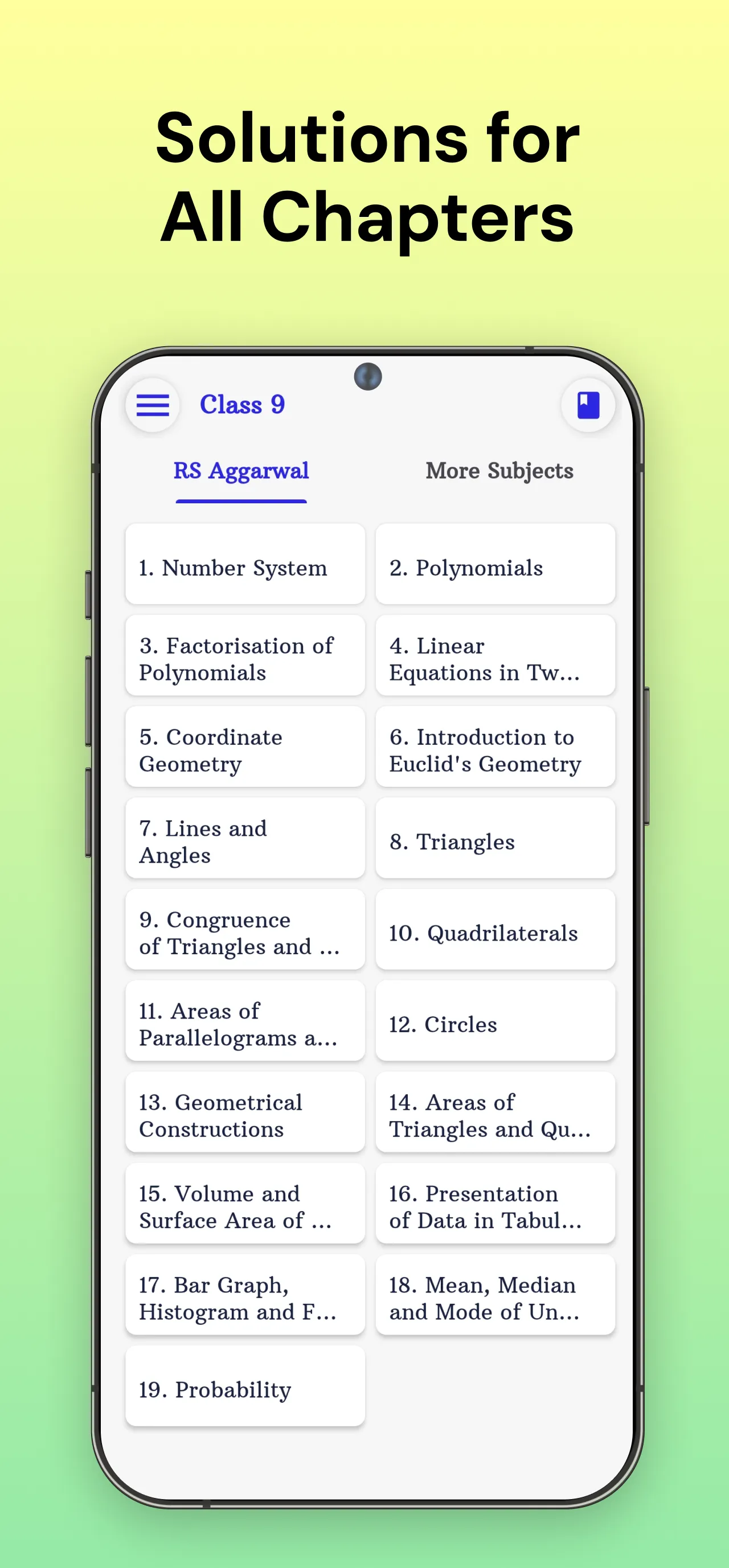 Get RS Aggarwal Class 9 Maths Book Solution and read offline. In this app, you will get the solutions to all the questions of the RS Aggarwal Math book. All the questions are solved in easy language with a logical flow that helps you to understand the concepts easily and clear all your doubts. This app is rich in features that will help students during solving problems. Main features RS Aggarwal Class 9 Solution the app: Best User Experience and Interface....