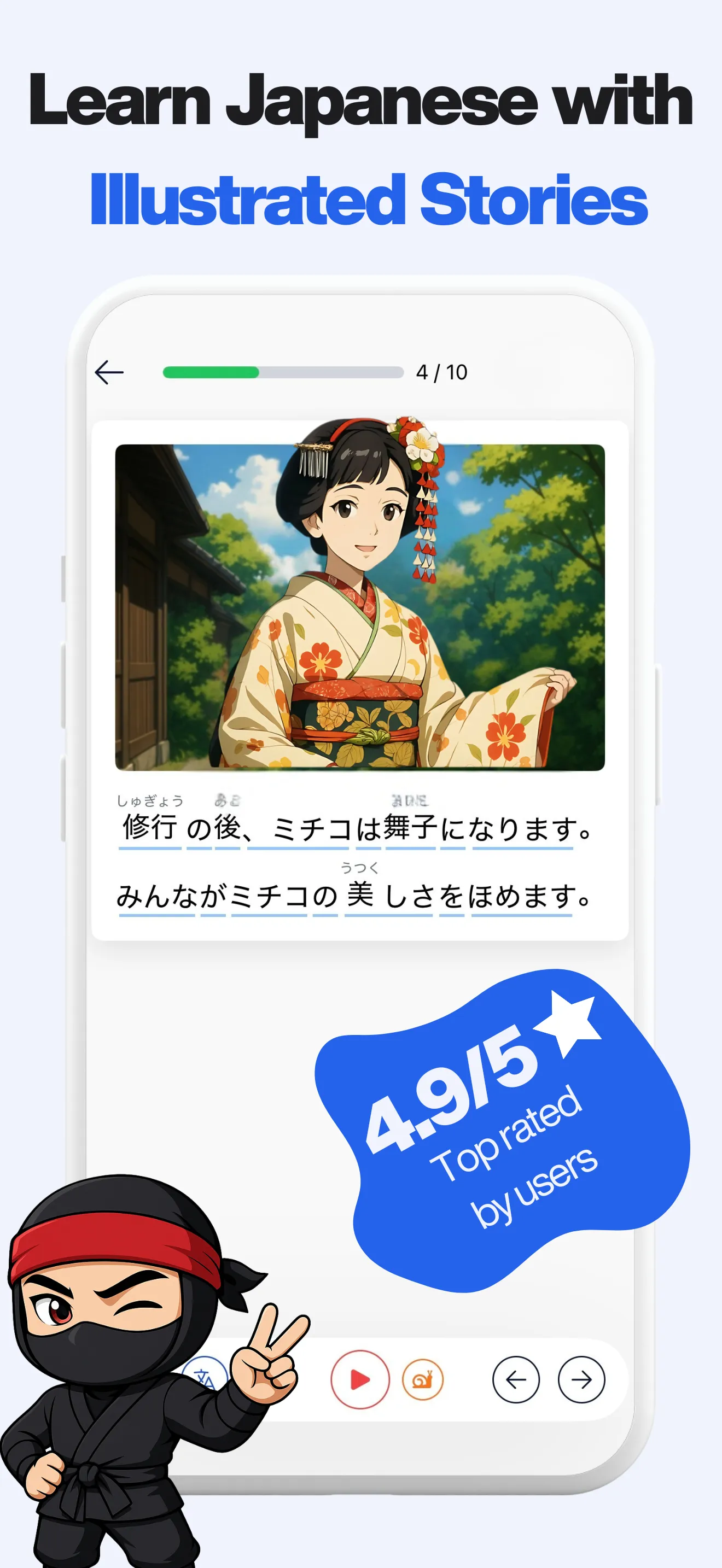 Shinobi: Read & Learn Japanese is the first reading-focused app that lets you grow from absolute beginner (below JLPT N5) all the way to JLPT N1—and beyond—through richly illustrated graded stories, daily easy news, and smart review tools. Instead of memorising lists, you absorb vocabulary, kanji and grammar together, in context. What makes Shinobi different ? • Graded illustrated stories – Hundreds of short, level-tagged stories written by native Japanese teachers. Art, dialog and narration evolve as your level rises, keeping difficulty just right. • Daily easy news – Follow Japanese news with bite-sized articles rewritten for learners; expand your vocabulary while exploring fresh topics every day....