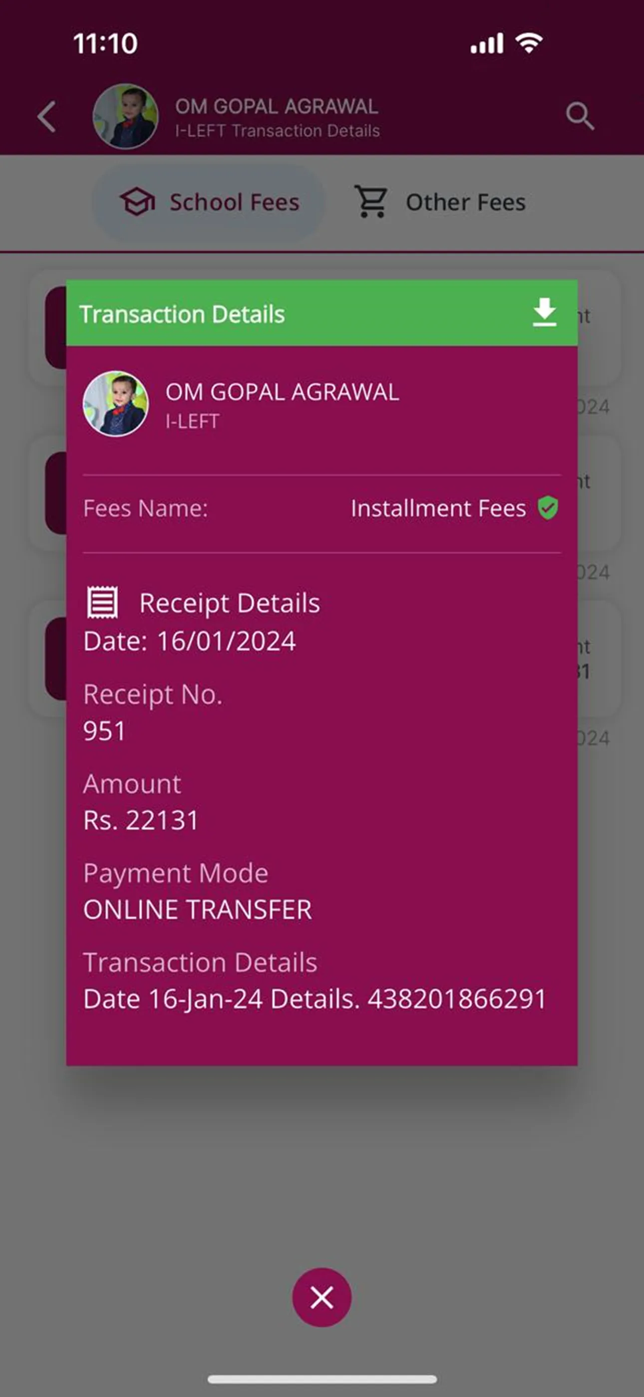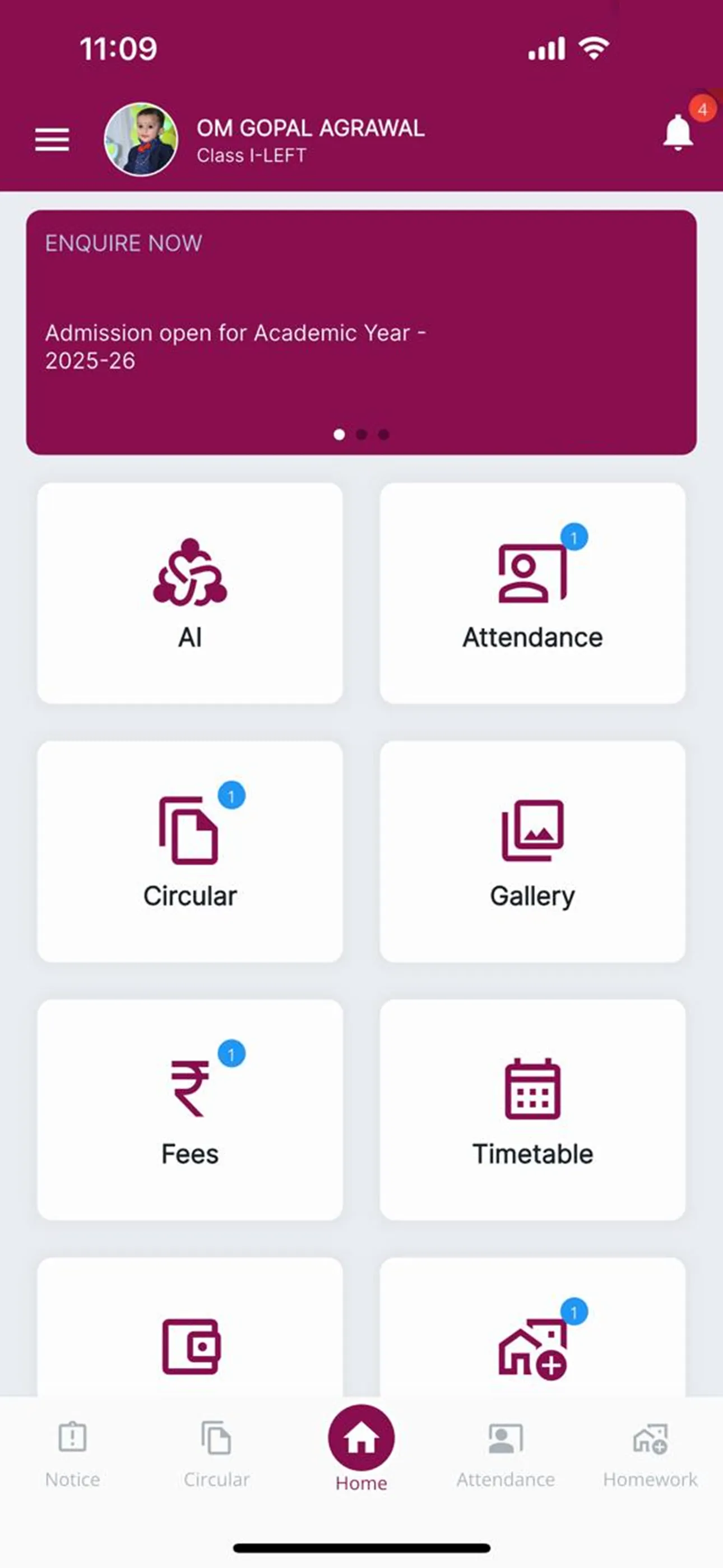 pp contains : - Child daily homework. - Events in school. - Fees status. - Performance report. - school calander. - Atendance. - circulars. - Time table. - profile. - and lots more