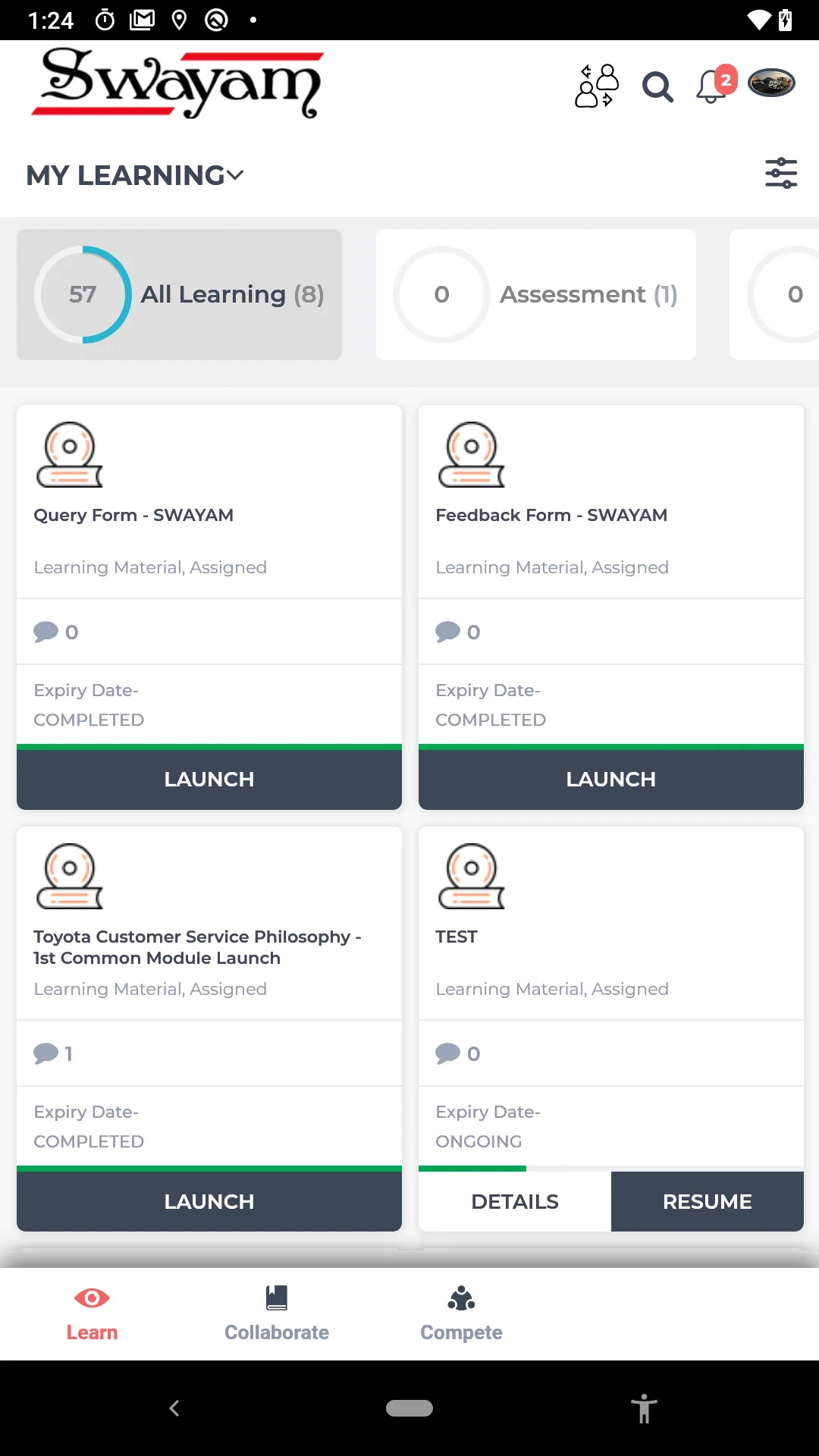 TOYOTA SWAYAM gives you the power to take your learning with you. Now access all your courses and take tests and quizzes on your smartphone or tablet. TOYOTA SWAYAM is the mobile solution for all TOYOTA SWAYAM users. - Log on to the Learner App with your LMS credentials - View Assigned courses and tests - View your progress - Access content and play directly on your device - Receive notifications for new assigned content - View consolidated report card - View News and Announcements