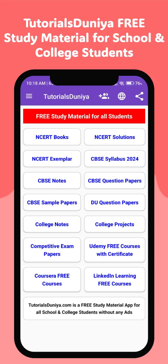 Hello, I'm Abhishek π and I always struggled to find Notes, Question Papers with Solutions, Projects, Sample Papers & other study material during my school and college time. I created this TutorialsDuniya app to solve this study material problem for every school and college student by providing all study material FREE of cost. I'm glad that TutorialsDuniya app has been used by more than 3,00,000 Students π ...