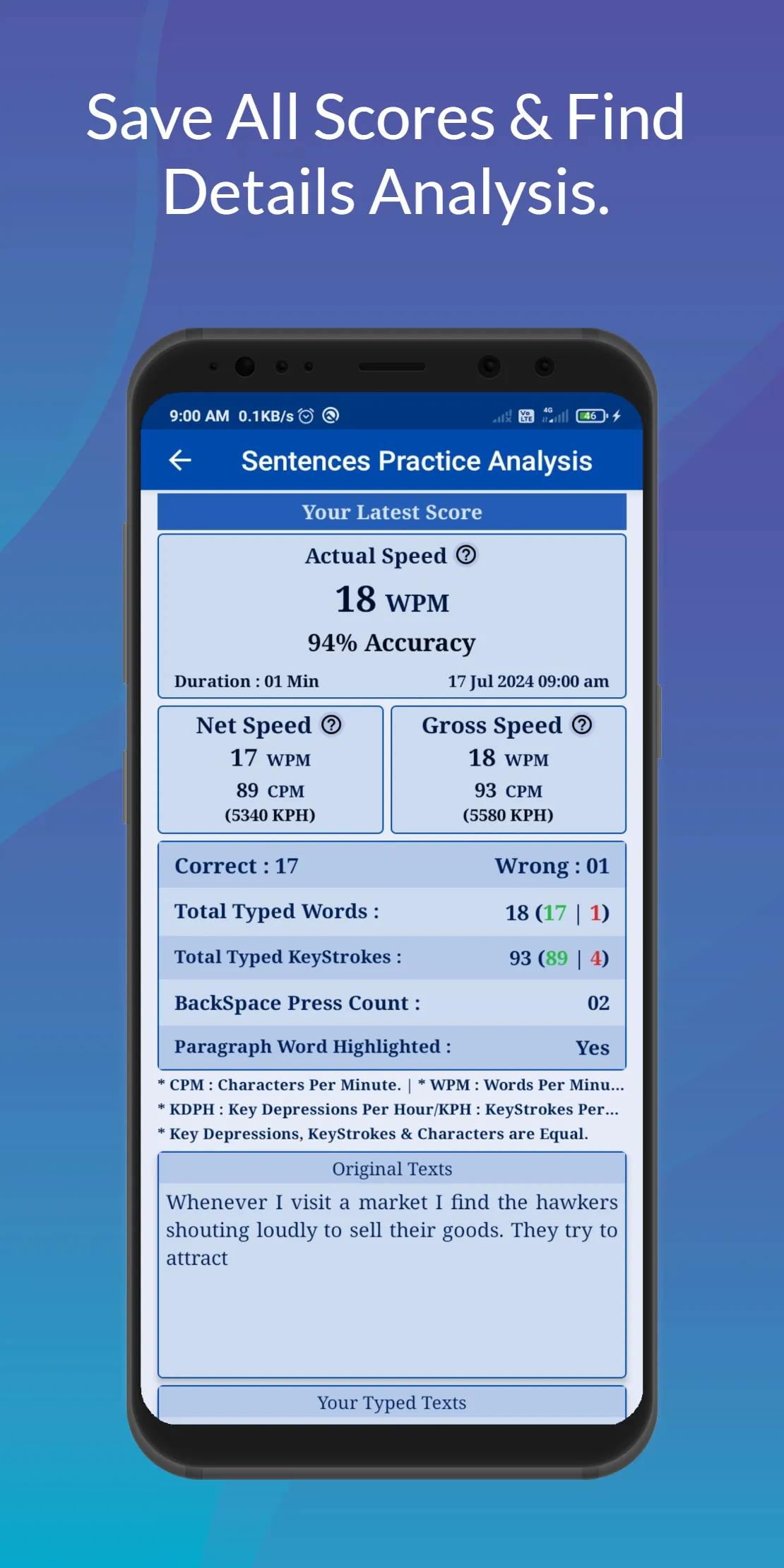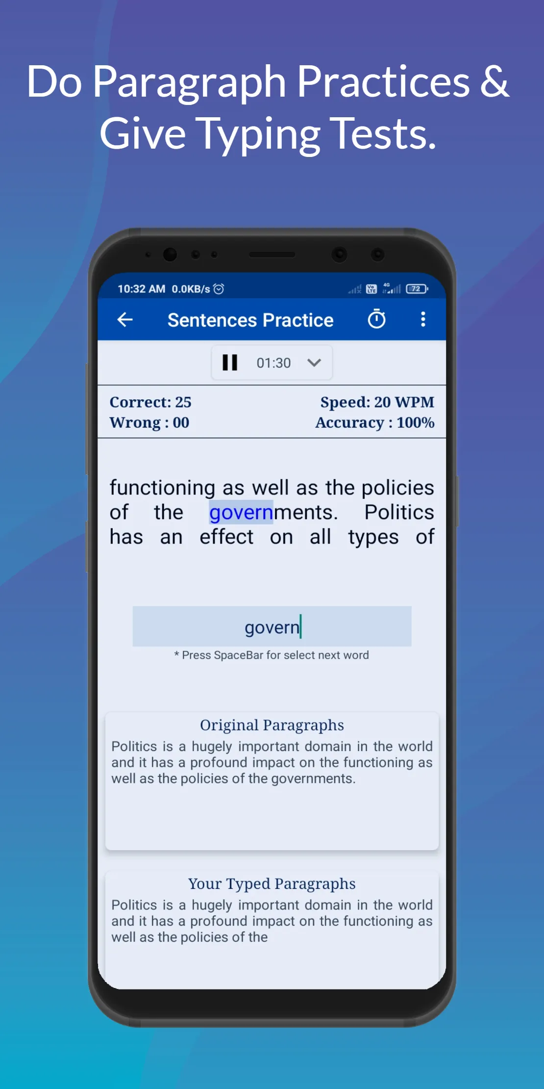 English Typing App is help to Increase Typing Speed in your mobile at Free of cost. This English Typing Practice App useful to Give Typing Test for Govt Exams or Others Typing Tests Exams. And this Typing Course App is Help to Learn English Touch Typing & Give Typing Speed Tests & Learn Computer Typing for Increase Computer Typing Speed on Mobile. And this English Typing Tutorials App is design for QWERTY Keyboard Layout. This is the English Typing Test App for SSC CGL, SSC CHSL, CRPF, CISF, NTPC and Others Govt Typing Speed Tests Exams or Programmers, Typewriters, Bloggers, or Any other typing related workers for Increase Typing Speed. This English Typing Master App is helpful for you Learn Typing in mobile. How to Use English Typing App : Connect External/Real keyboard on Mobile via OTG Cable/Bluetooth and Open English Typing Plus App and Find how fast your Typing Speed and Accuracy. Use like a Computer Typing App in Mobile....