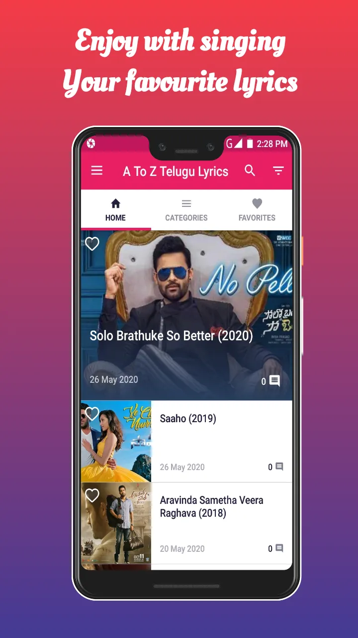 A To Z Telugu Lyrics app is provide all telugu lyrics of movie songs, poems, slokas, devotional, folk, private album songs. Mainly, The following list of telugu language movies is available in this app:- 2,000+ More Movie Album Songs Lyrics- [Ala Vaikuntapuramlo, Sarileru Neekevvaru, Venky Mama, Pratiroju Pandaage, Gang Leader, iSmart Shankar, Guna 369, Kausalya Krishnamurthy, Sahoo, Dorasaani, Petta, Brochevarevaru Ra, Ninu Veedani Needanu Nene, Sita, Suryakantham, Ranarangam, Marshi, F2, Mari 2, Vinaya Videya Rama, Dear Camred, Jersy, Majili, ABCD, 118, Manju, Geetha Govindam, Aravinda Sametha Veera Raghava,Bahubali, Rangasthalam,Bharat Ane Nenu, Krishnarjuna Yudham, Chalo, Mahanati,Tholi Prema, Agnyaathavaasi, Nenu Sailaja, Saahasam Swaasagam Sagipo, Sarrainodu, Sree Mani, Janatha Garage, Dhruva, Duvvada Jagannadham, Khaidi No. 150, Fidaa, Ninnu Kori, Spyder, Attarintiki Daredi ...etc,...