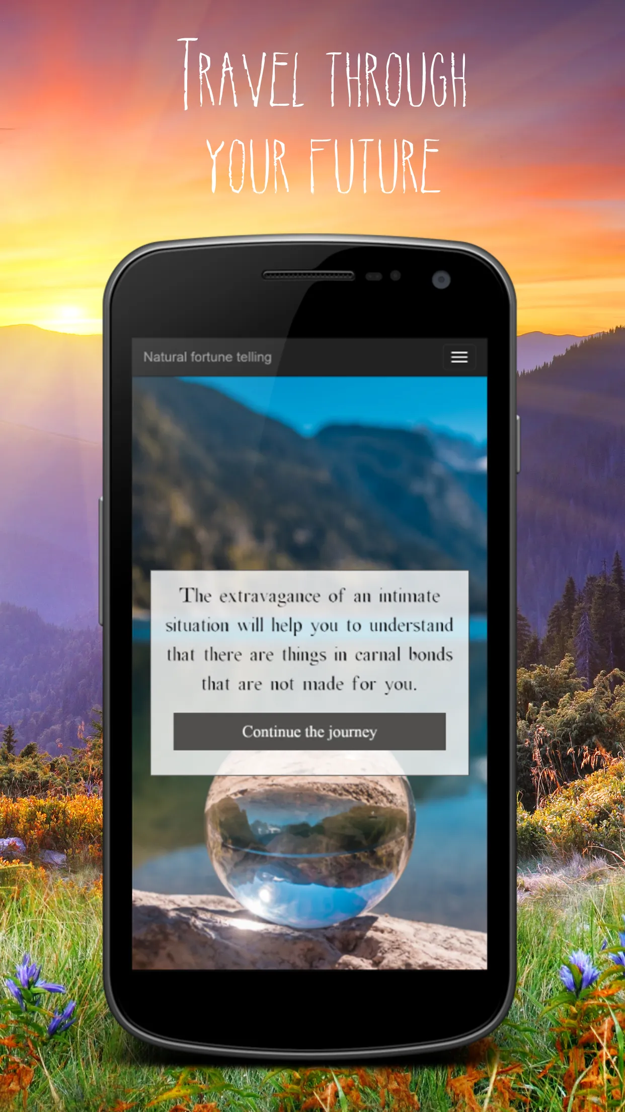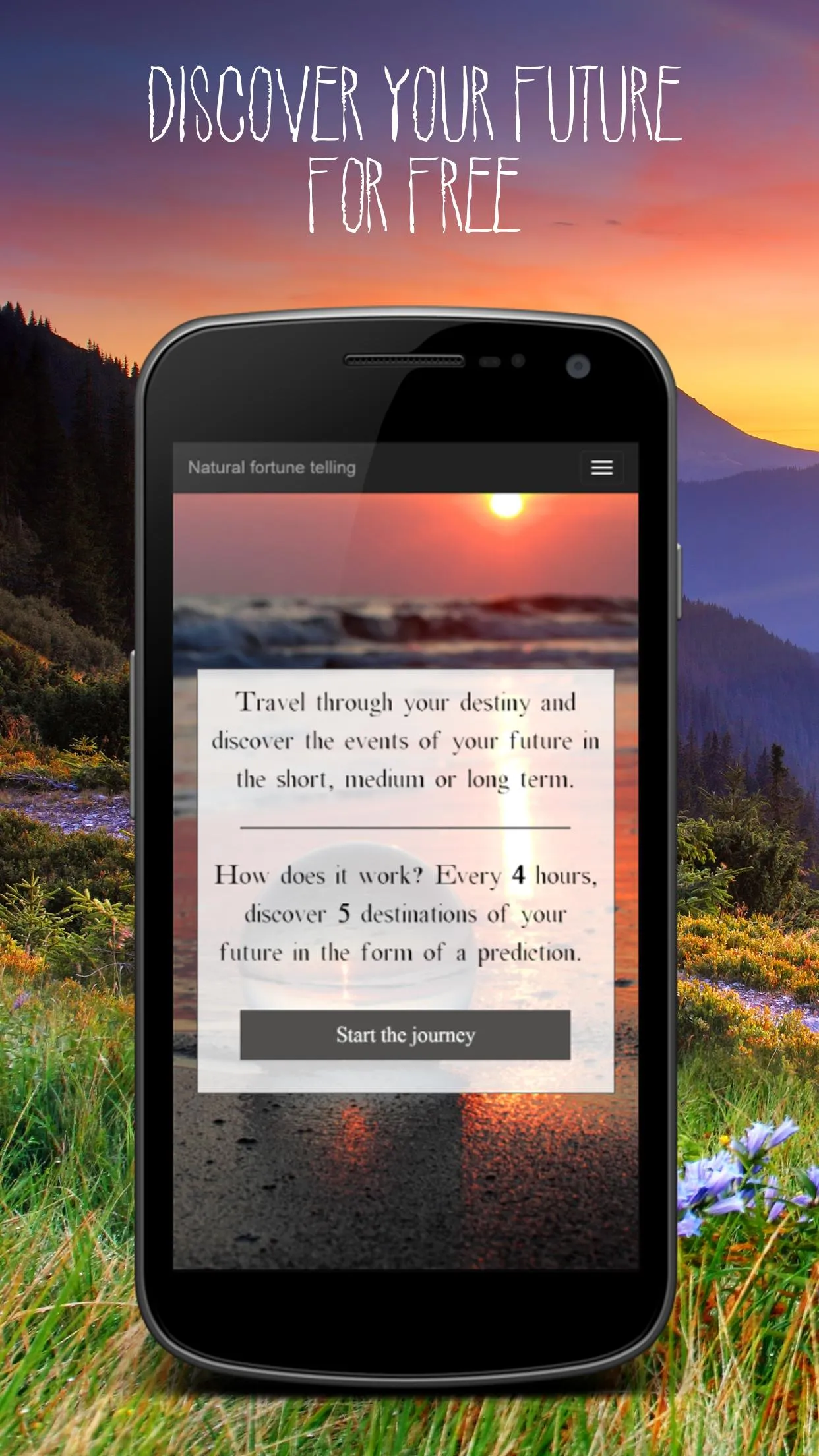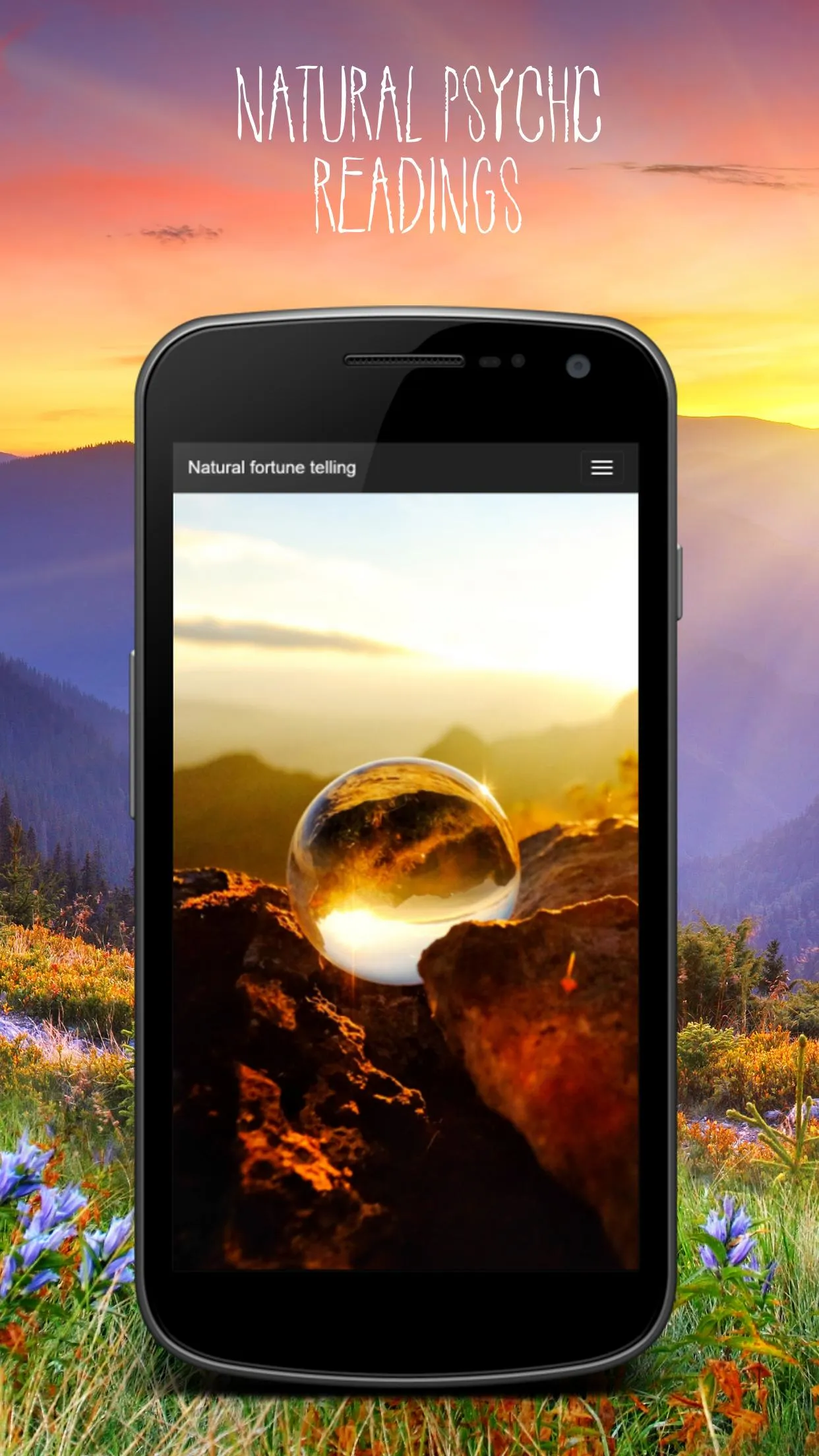 Really natural and real psychic readings ! This free fortuneteller application allows you to take a fascinating journey through your future and destiny. Thanks to the combined power of the crystal ball and the forces of nature, you will obtain a clear vision of your future, 100% natural and true. Your destiny is intrinsically linked to that of the planet Earth. It is for this reason that listening to it gives this psychic readings app an extraordinary ability to read the events that will punctuate your future life. Letting this free energy invade you is probably one of the best ways to stay in touch with yourself today. This application will help you do that. The natural fortune telling that uses the planet's natural vectors is undoubtedly the purest, most powerful that exists. You will get truly powerful and true psychic readings. ...
