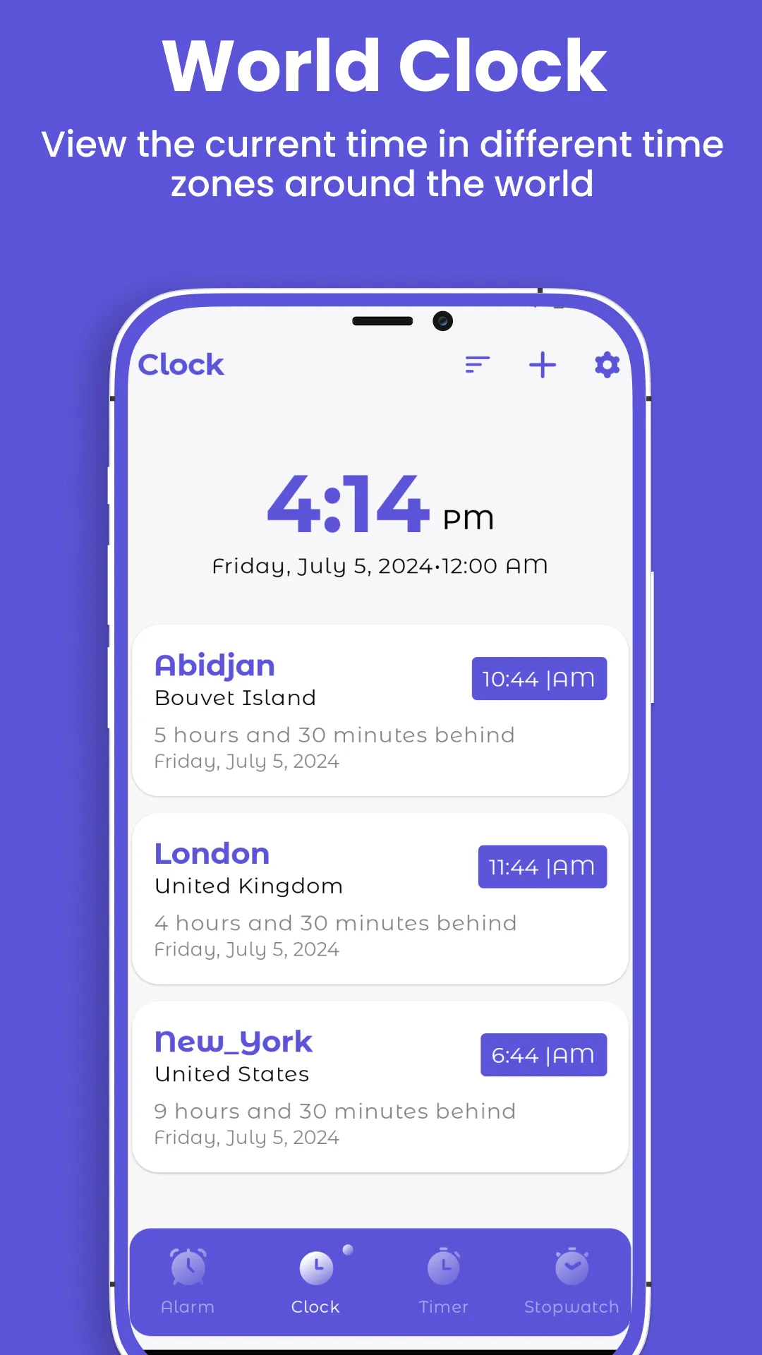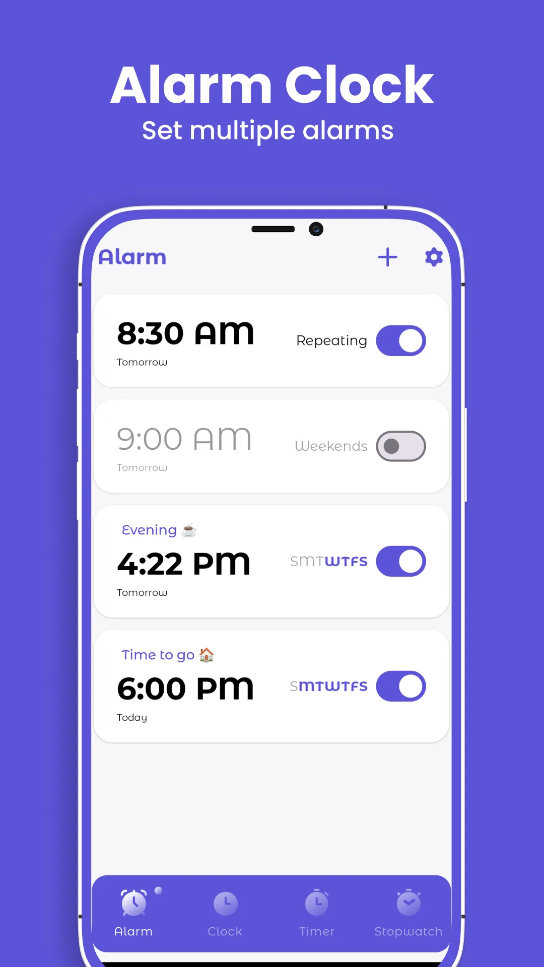 The Alarm Clock app is a simple and reliable tool to help you manage your time effectively. It includes essential features like alarms, a world clock, a stopwatch, and a timer, all designed to help you stay organized and on track. Whether you need a daily wake-up alarm, a timer for tasks, or a world clock to track different time zones, this app has everything you need. Key Features 🌟 Alarm Clock: Create an alarm for events with snooze settings 🌟 World Clock: View the time in cities worldwide with different time zone 🌟 Stopwatch: Use the stopwatch for time tracking & save results for later reference....