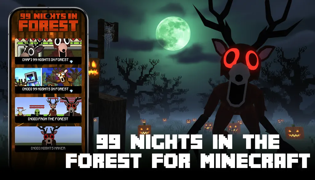 Download 99 Nights in the Forest Mod for Minecraft and transform your world with the most chilling and challenging characters! Ready for a unique horror and survival experience in Minecraft? This is the ultimate installer for Minecraft fans looking to add the popular 99 Nights in the Forest mod to their game. With our app, you can easily install a variety of mods, addons, and maps inspired by 99 Nights in the Forest. Confront the most terrifying creatures, like the fearsome Deer God and other forest monsters, as you try to survive in a hostile and dark environment. Get ready for endless nights of horror and adventure in your Minecraft world! ...