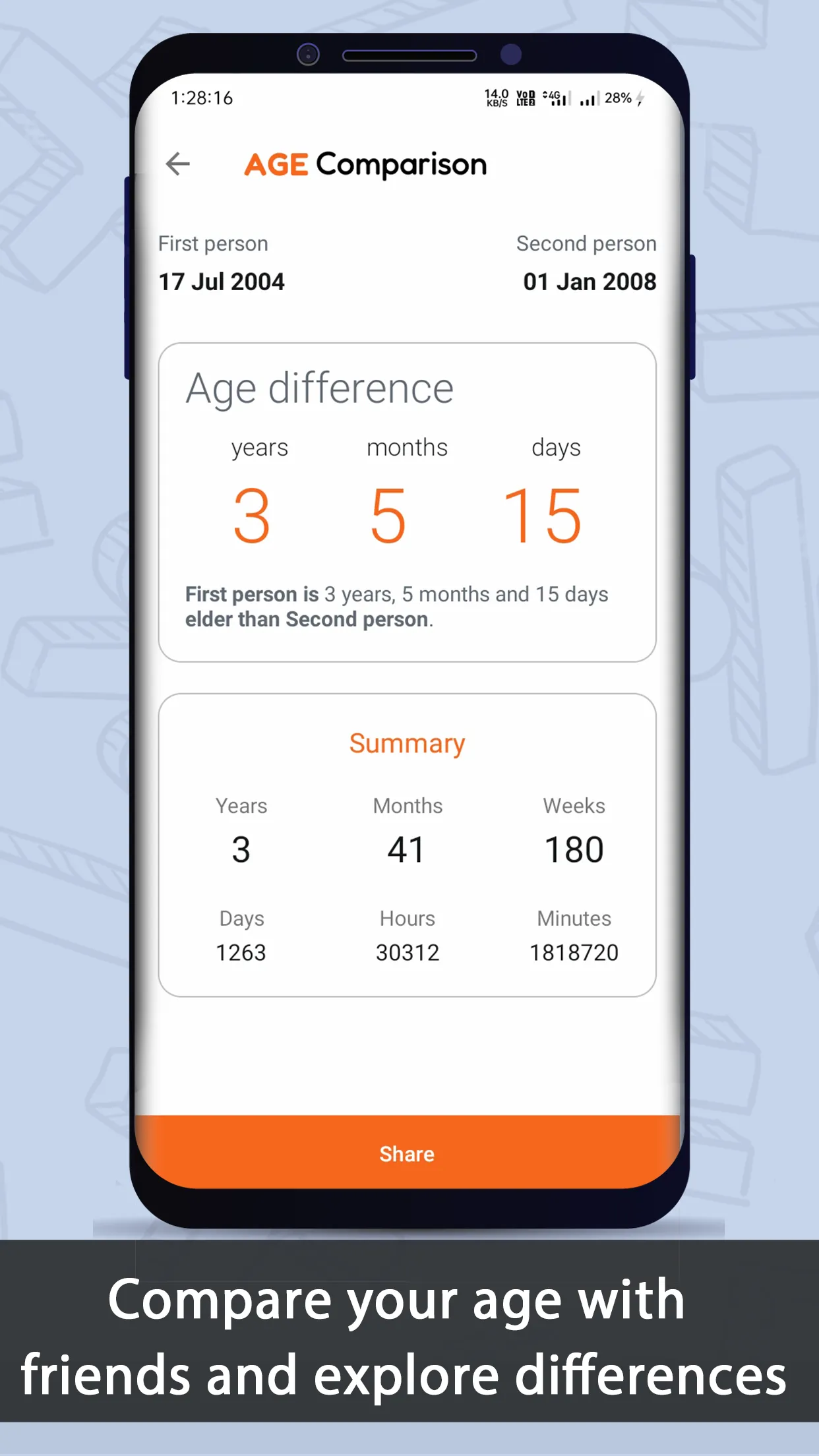 Unlock a World of Age-Related Insights with Age & Birthday Calculator! Introducing our enhanced Android app, designed to accurately calculate ages in various formats, unravel captivating age facts, and enable seamless age-related comparisons. Discover the power of precise calculations and explore the significance of birthdays and milestones. Download now and embark on a journey of age discovery! 🎂 Accurate Age Calculation: Effortlessly determine someone's age with precision. Enter their date of birth, and our app will calculate their age in years, months, days, hours, minutes, and even weeks. Bid farewell to guesswork and embrace the realm of accurate age calculations. ...