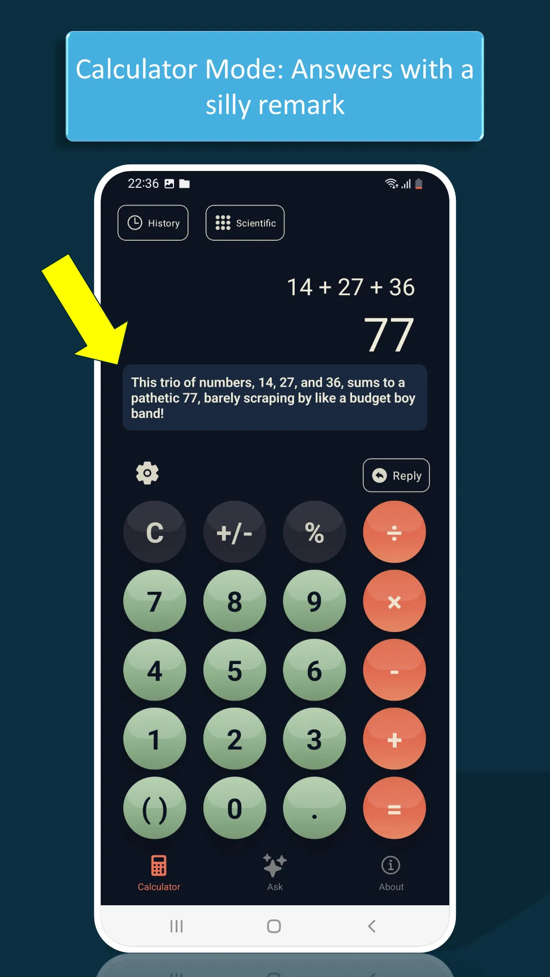 A calculator reimagined. It's like a normal calculator, but we added AI. Tired of boring number crunching? AI Calculator makes math fun, smart, and effortless. Not only does it deliver precise results, it also entertains you with witty AI-generated remarks and gives you a built-in math chatbot that now supports image uploads. Whether you need quick calculations, detailed explanations, or photo-based problem solving, AI Calculator has you covered. ...