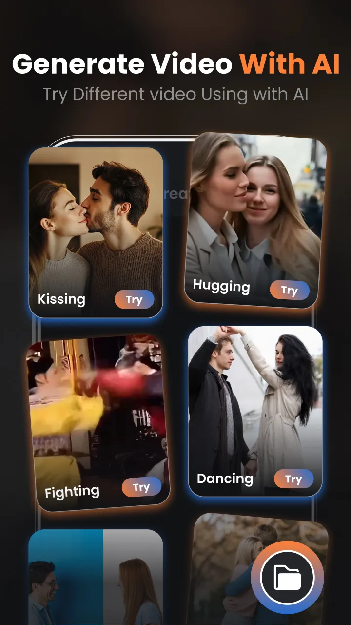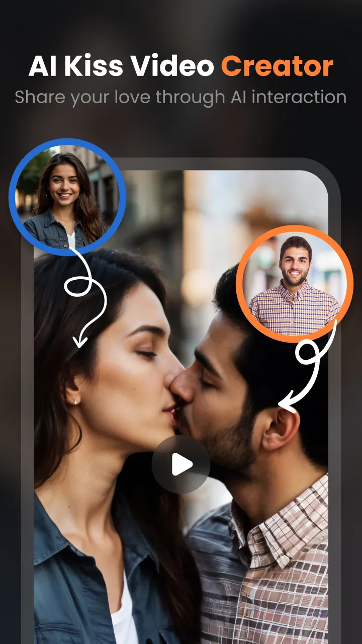 AI Kissing Video Generator is an amazing tool that lets you turn any two different images into captivating video animation clips. With the AI Kiss Video Generator app, you can create mesmerizing videos with a wide range of motions, including kissing, hugging, fighting, dancing, handholding, and cuddling. With AI Video Maker, simply select two images, and with just a tap on the generate button, the AI will transform them into engaging different animations like AI Kiss Video, AI Hug Video, AI Dance Video, AI Holding Hands Video, and also an AI cuddling video clip that's sure you did like real with photo animations. AI Kissing Video Generator app makes it incredibly easy to create these stunning videos, even if you have no prior video editing experience. The AI Photo Video Generator allows you to browse through your gallery or upload new images and then convert your photos into various animation effects. Once you've selected your images and animation style, the AI Video Maker app will do the animations in photos by your choice of effects. You can save your creations in the My Creations app and share them with friends, family, or on social media. Whether you're looking to add animations to photos, add a personal touch to a special message, or simply want to have fun experimenting with creative animation, the AI Kissing Video Generator app is the perfect tool for you. Features: ...