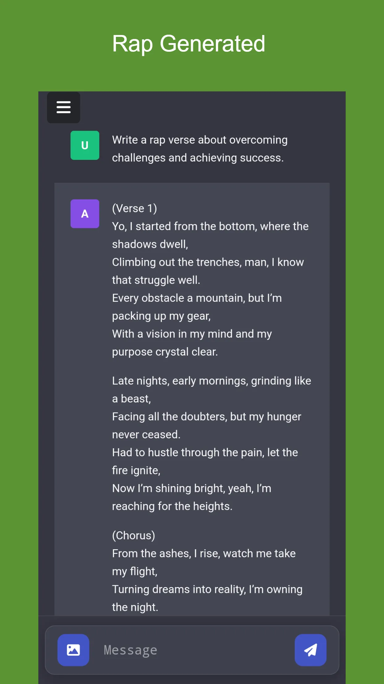 Unleash your inner rapper with AI Rap Generator, the ultimate app for creating unique and personalized rap lyrics! Whether you're a seasoned rapper or just starting your journey, our app helps you craft rhymes, verses, and full rap songs effortlessly. Powered by advanced AI technology, AI Rap Generator allows you to: Generate Custom Raps: Simply type your theme or topic, and let the app create compelling rap lyrics tailored to your input. ...