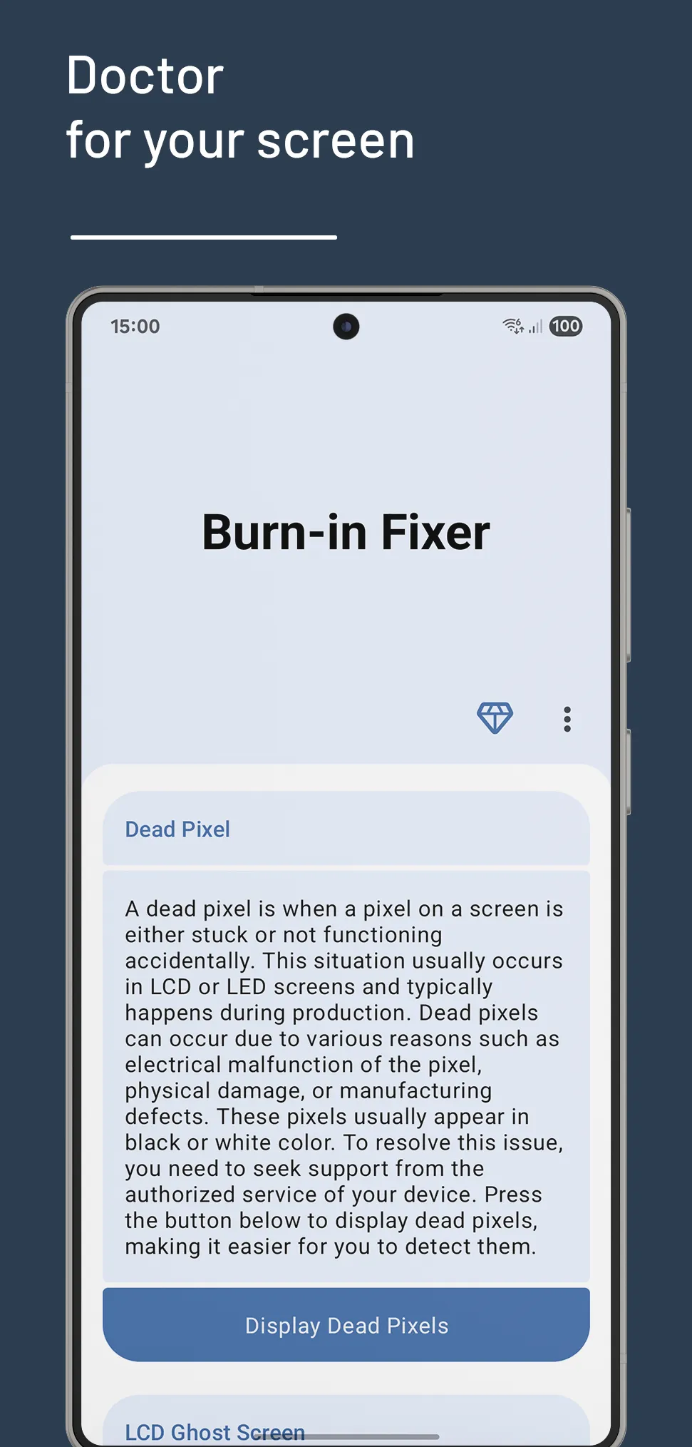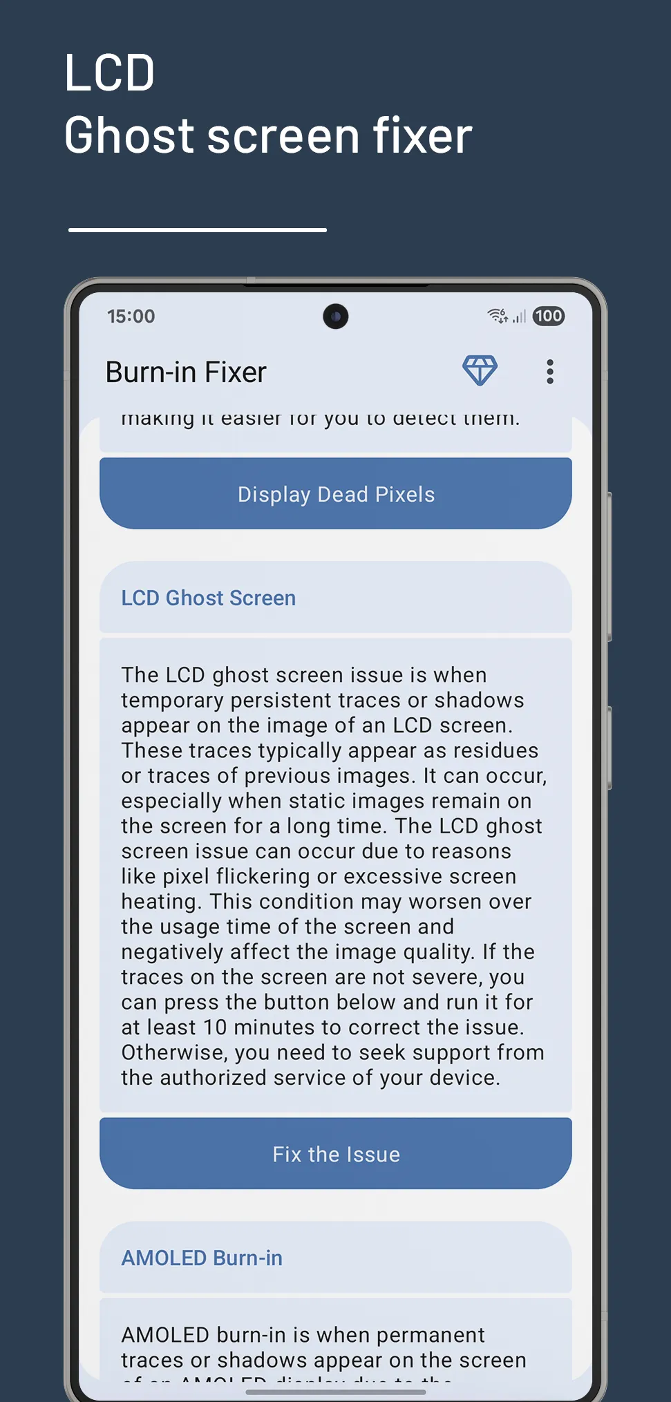 Burn-in Fixer provides visual tools that help you display and address screen issues such as ghosting, AMOLED burn-in, and dead pixels. With color patterns and effect screens, it becomes easier to notice traces and start correction modes when needed. Highlighted capabilities: ✦ Offers color and motion-based correction modes for temporary LCD ghosting. ✦ Uses color cycles and visual patterns to help reduce AMOLED burn-in traces. ✦ Displays full-screen color tests to help identify dead or stuck pixels....