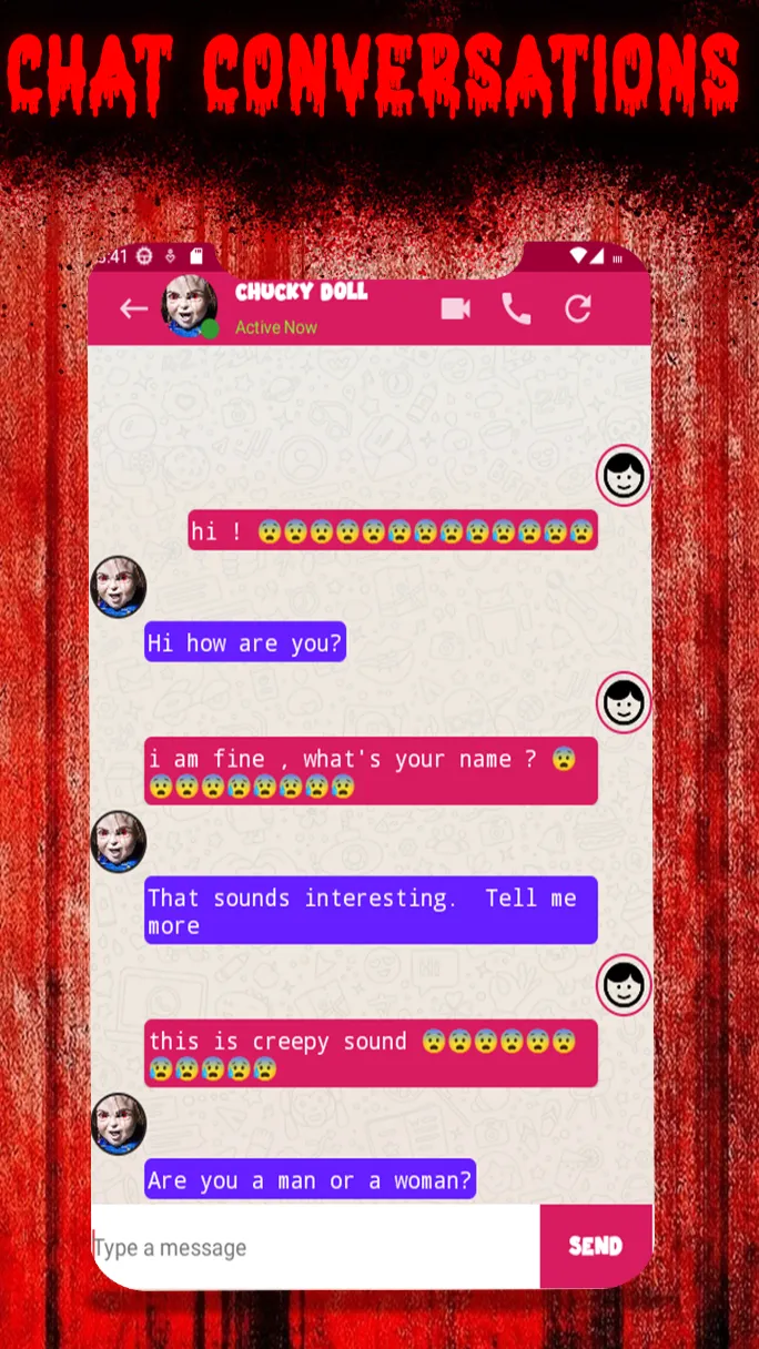 This app allows you to set incoming fake call, fake video call and a chat simulation with the Creepy chucky Doll it is a dial app that simulate receiving calls and video calls from the creepy chucky Doll and also have a long chat with him, it can easily be used to prank friends or family members and watch their surprised faces when they receive the horrific call, it my also have many other features as you will find below this dial app will allow you to use your phone in order to prank your friends because it gives a simulation of talking and chatting with the sweet and funny scary chucky Doll. thanks to this app you won't get bored easily and you will have the possibility to receive lots of calls and chat messages. Features: ➥ Fake Video Call. ➥ Fake Call. ➥ Messages and Chat....
