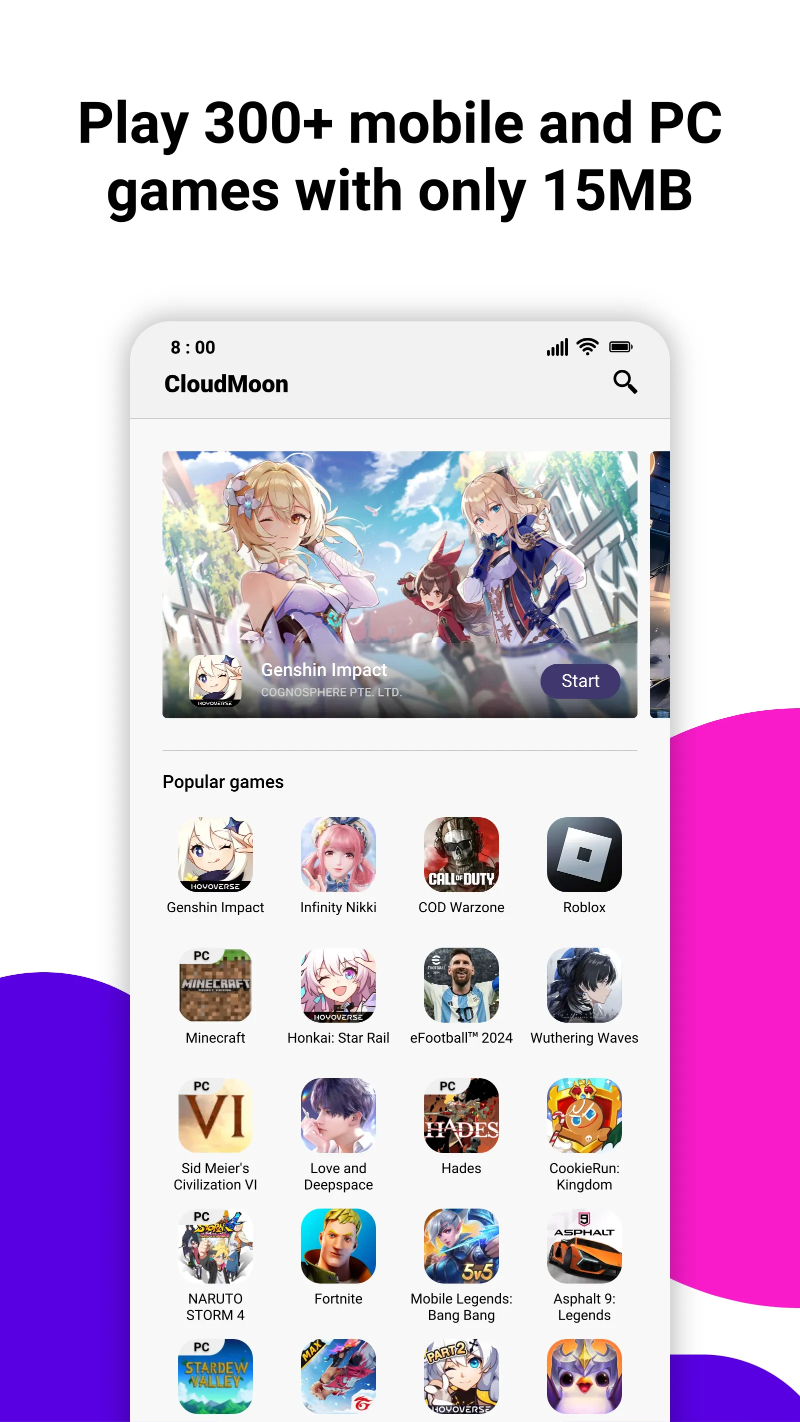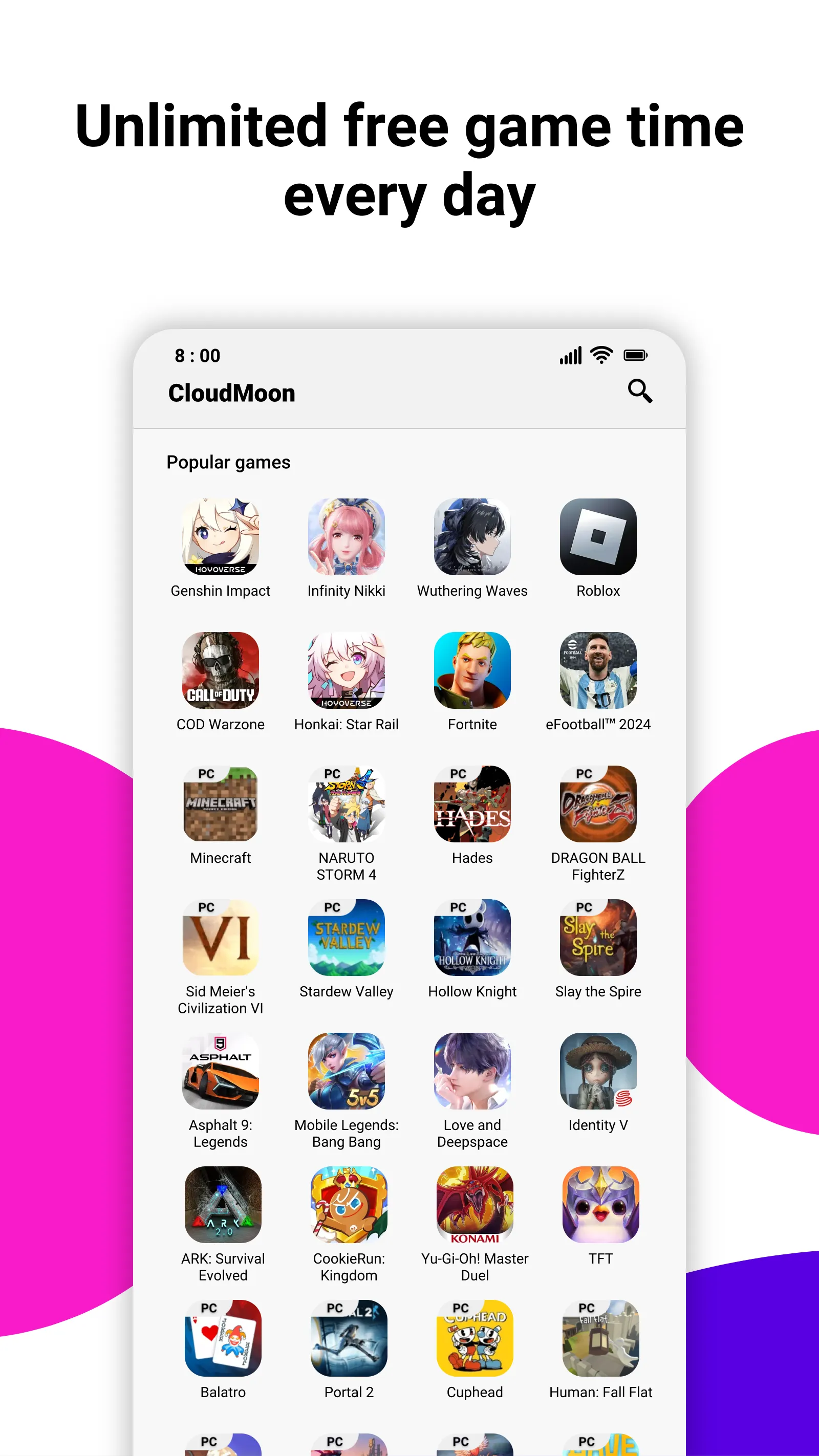 Get your free high-performance cloud phone today! CloudMoon harnesses the power of cloud computing to deliver hundreds of high-quality games like Genshin Impact, Infinity Nikki, Roblox, Mobile Legends, Fortnite, and Call of Duty®: Warzone™ Mobile directly to your device. With CloudMoon, there's no need to install or download games anymore. Whether you're on a low-spec device or have limited storage, CloudMoon brings you top-tier gaming without compromise. Simply tap and start instantly, enjoy seamless gameplay without worrying about massive battery consumption, and without burdening your phone's storage or causing it to overheat. ...