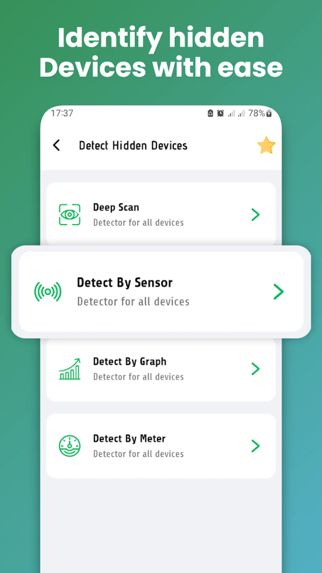 Tracking Device Detector Tool – Secure Your Privacy!In today's world, protecting your privacy is more important than ever. With the Tracking Device Detector Tool, you can easily detect hidden cameras, microphones, and other surveillance devices that may compromise security. Whether in a hotel, a changing room, or your home, the Detect Hidden Camera Finder will ensure you're safe from unwanted surveillance. The Hidden Camera Detector Finder: Bug Locator provides a reliable way to find bugs and devices using your phone's magnetic sensor. Stay one step ahead and uncover any threats around you with All Device Detector. 📄 Tracking Device Detector Tool Key Features:📄 🔍Hidden Camera Detector Finder: Bug Locator—easily find cameras and bugs using magnetic detection;...