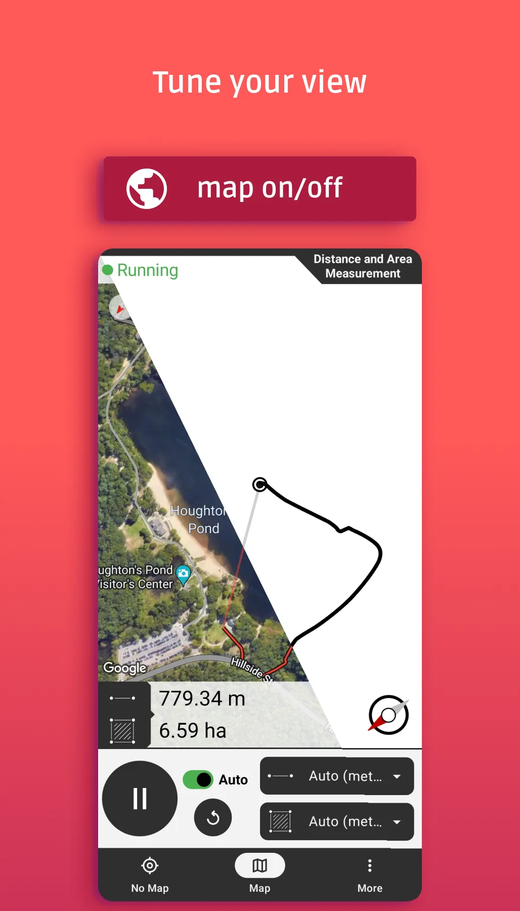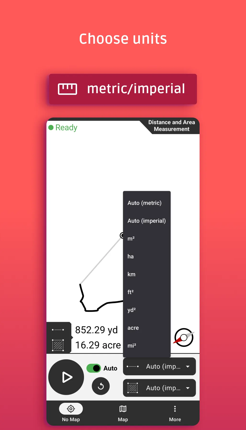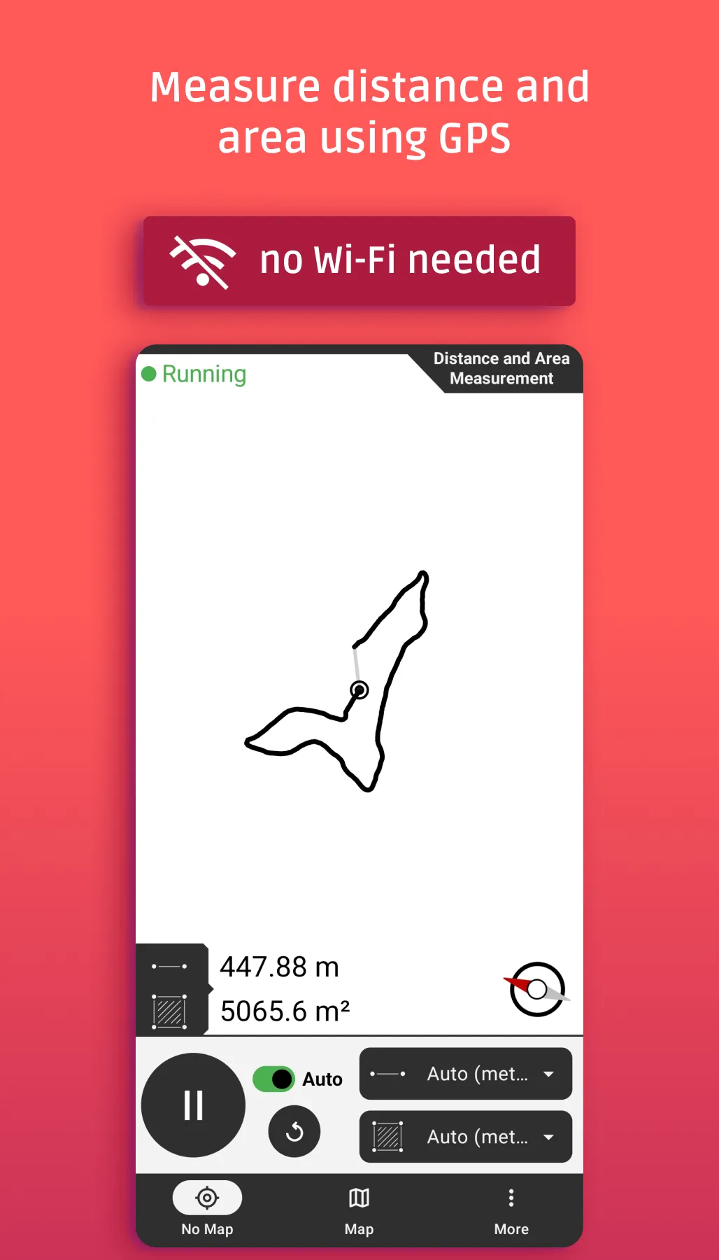 Distance and area measurement. For land surveying in agriculture, construction, real estate and property management, etc. Turn this application on and walk or drive around a region to measure its area. The path's length is measured as well. To start a measurement; wait until the GPS receiver is ready and then press start. If the positioning is a little shaky in the beginning, press restart as soon as it has stabilized.