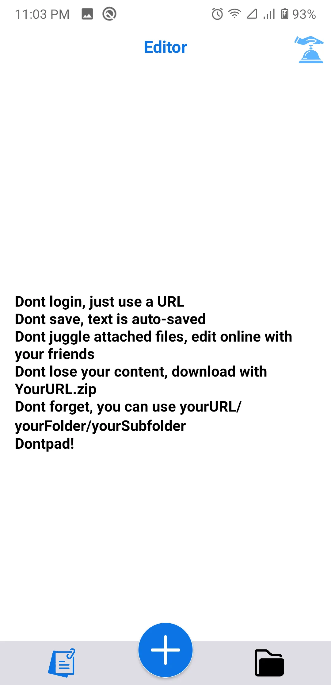 The simplest way to share text online Dont login, just use a URL Dont save, text is auto-saved Dont juggle attached files, edit online with your friends Dont lose your content, download with YourURL.zip Dont forget, you can use yourURL/yourFolder/yourSubfolder Dontpad!