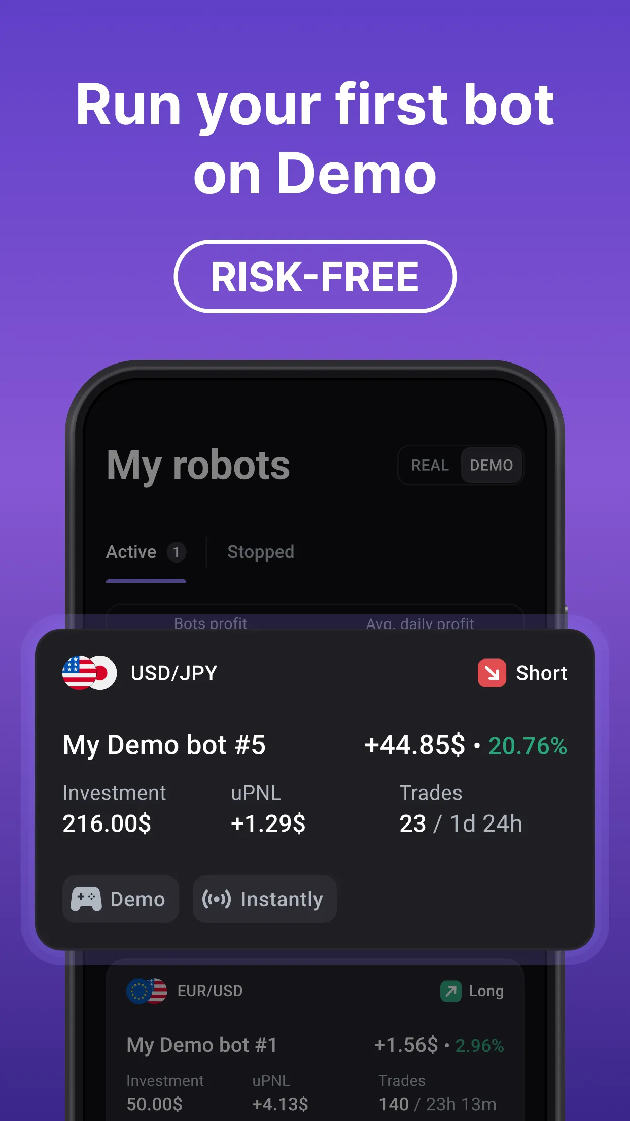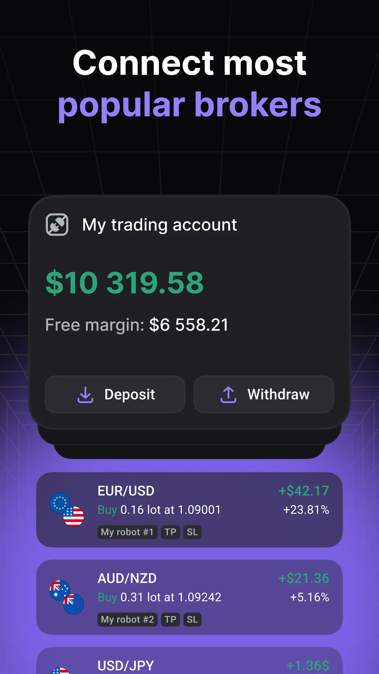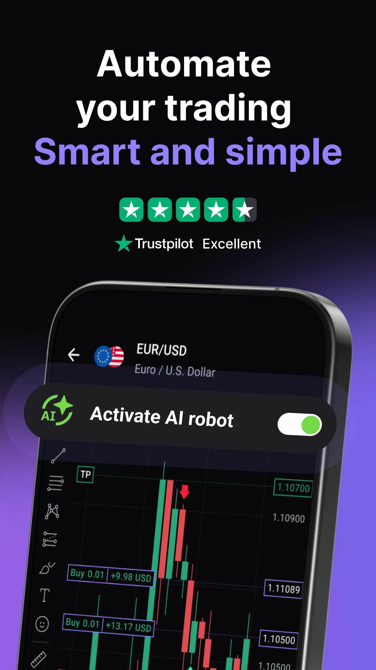 Elirox is an automated trading app that helps you trade smart and simple. Launch trading bots in financial markets right from your phone, without any complicated setups. Get the mobile trading app and automate your trading today with our AI trading bot. EASY TO START With Elirox trading automation,trading becomes easier. Start automating your trades in a few steps: ...