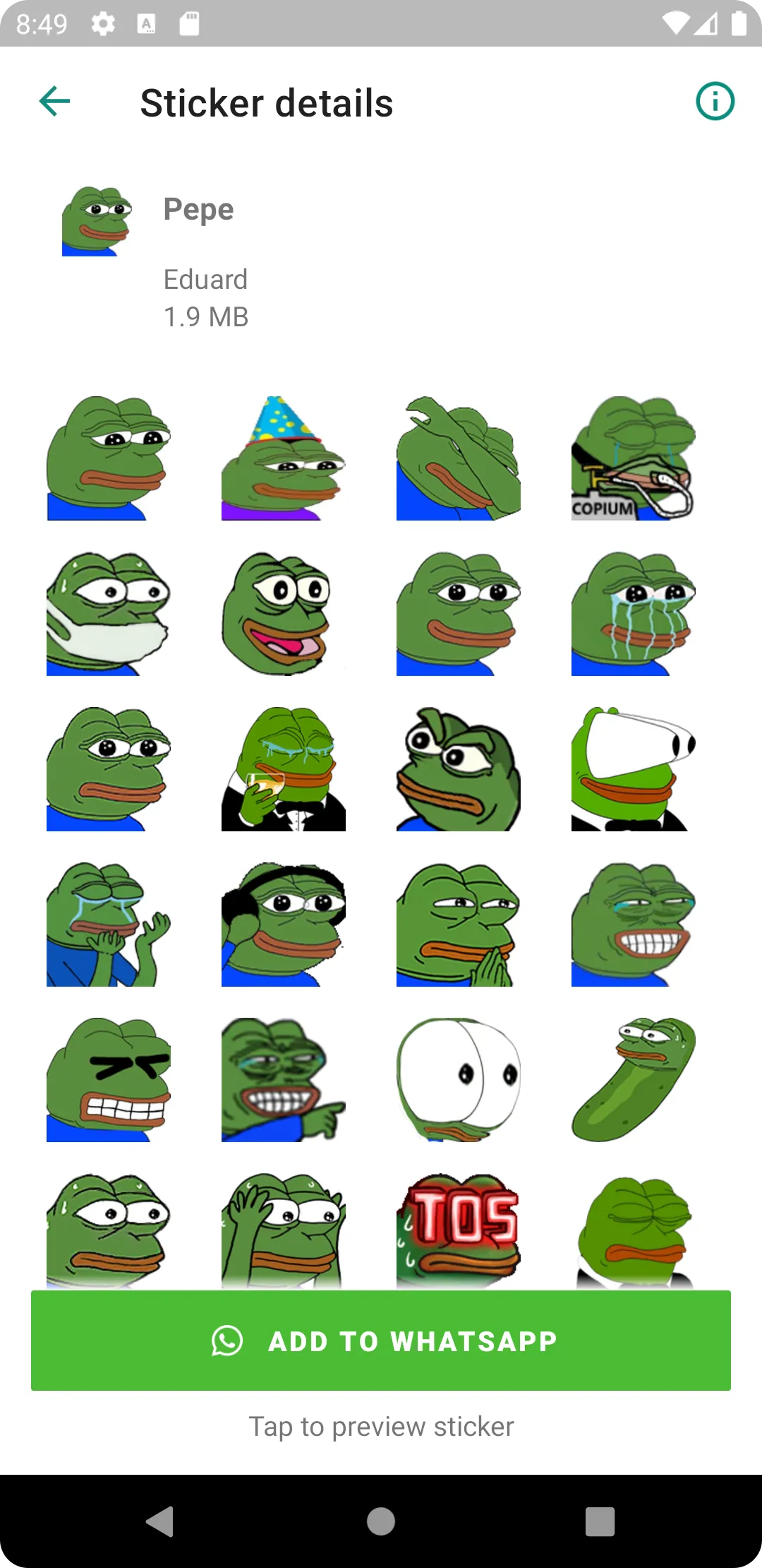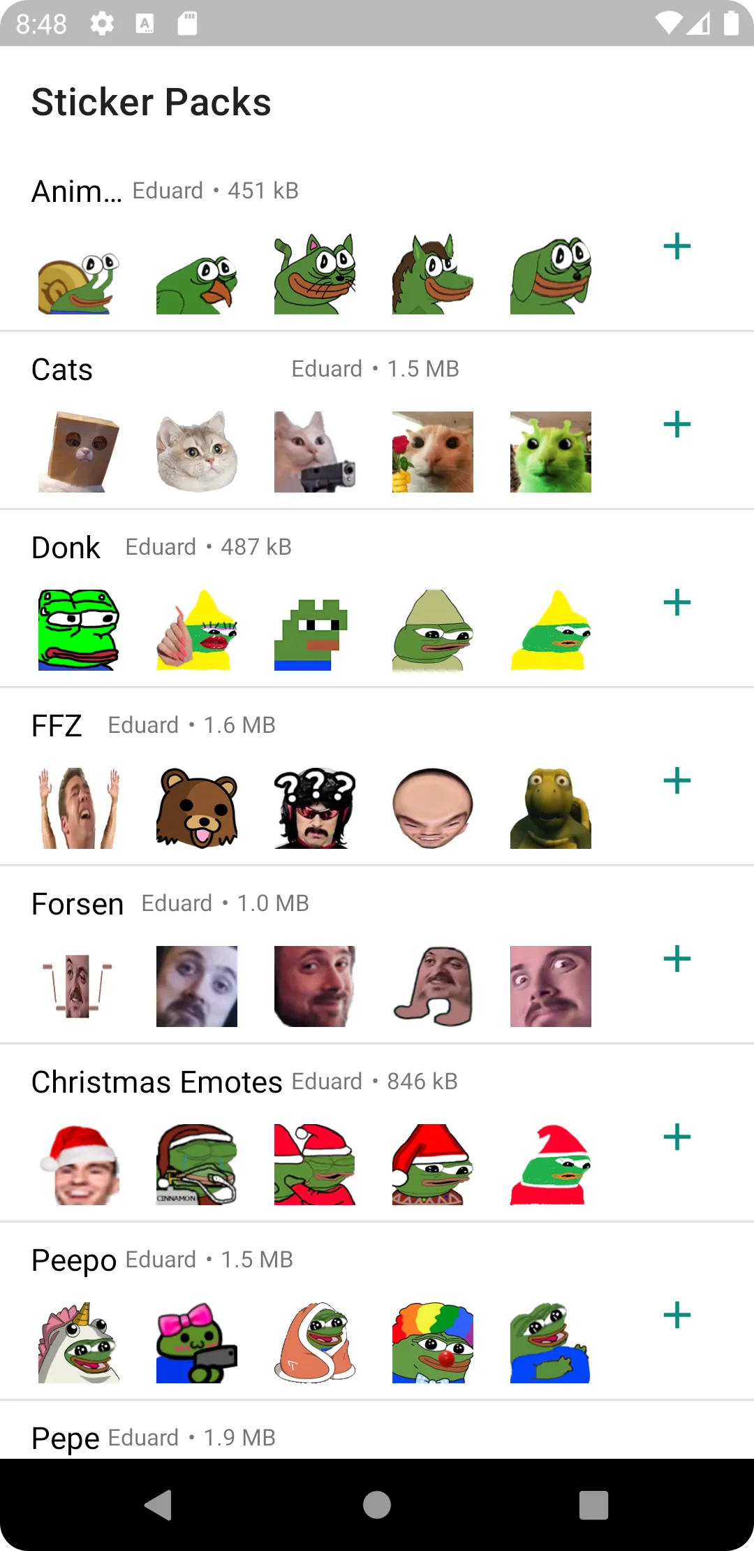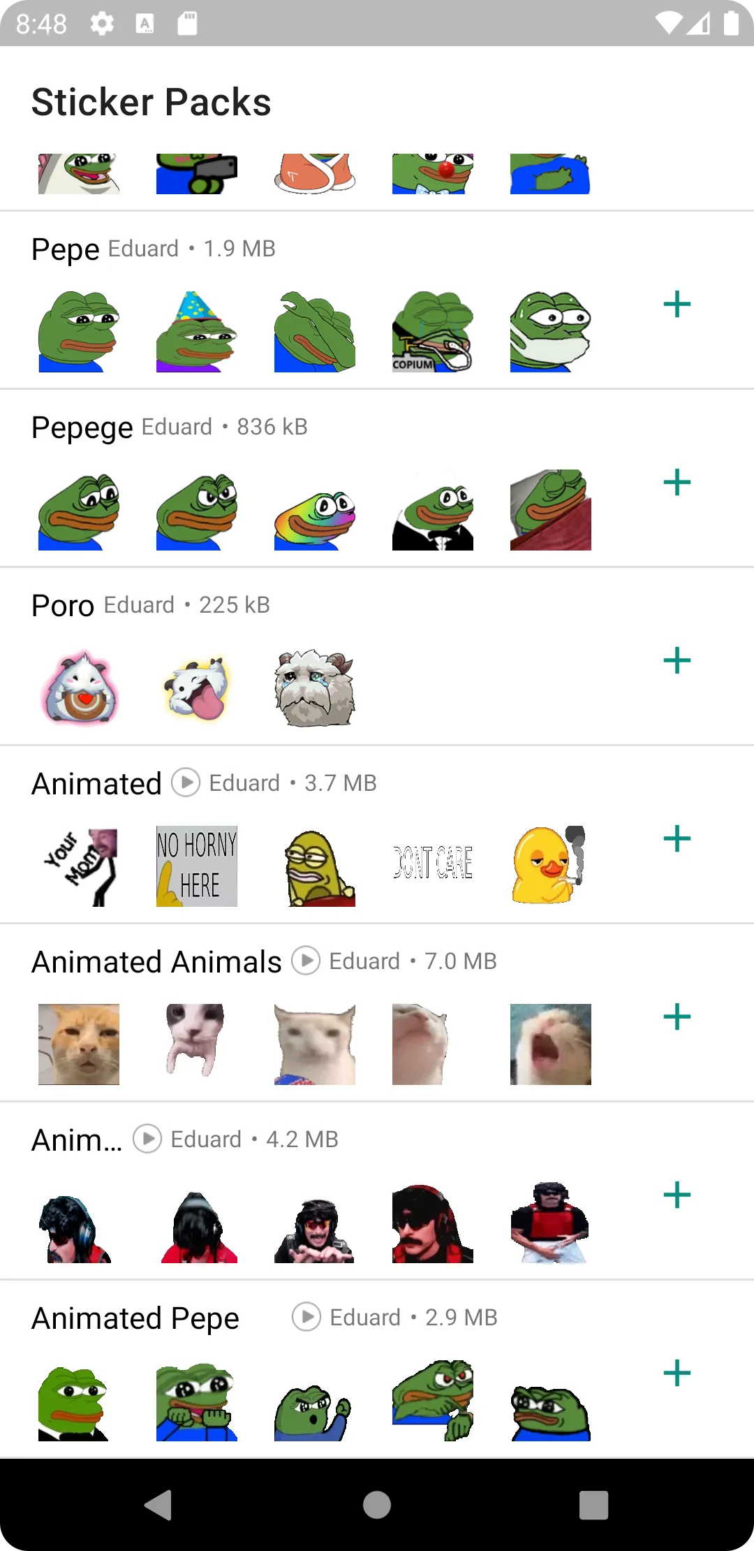 Multiple static and animated sticker packs for WhatsApp, mostly from 7TV. Yeah, I know this is like a third party thing but... 🐈Animals 🐸Pepe / Peepo / Pepege / Donk 🐎Forsen 🏆DoctorD