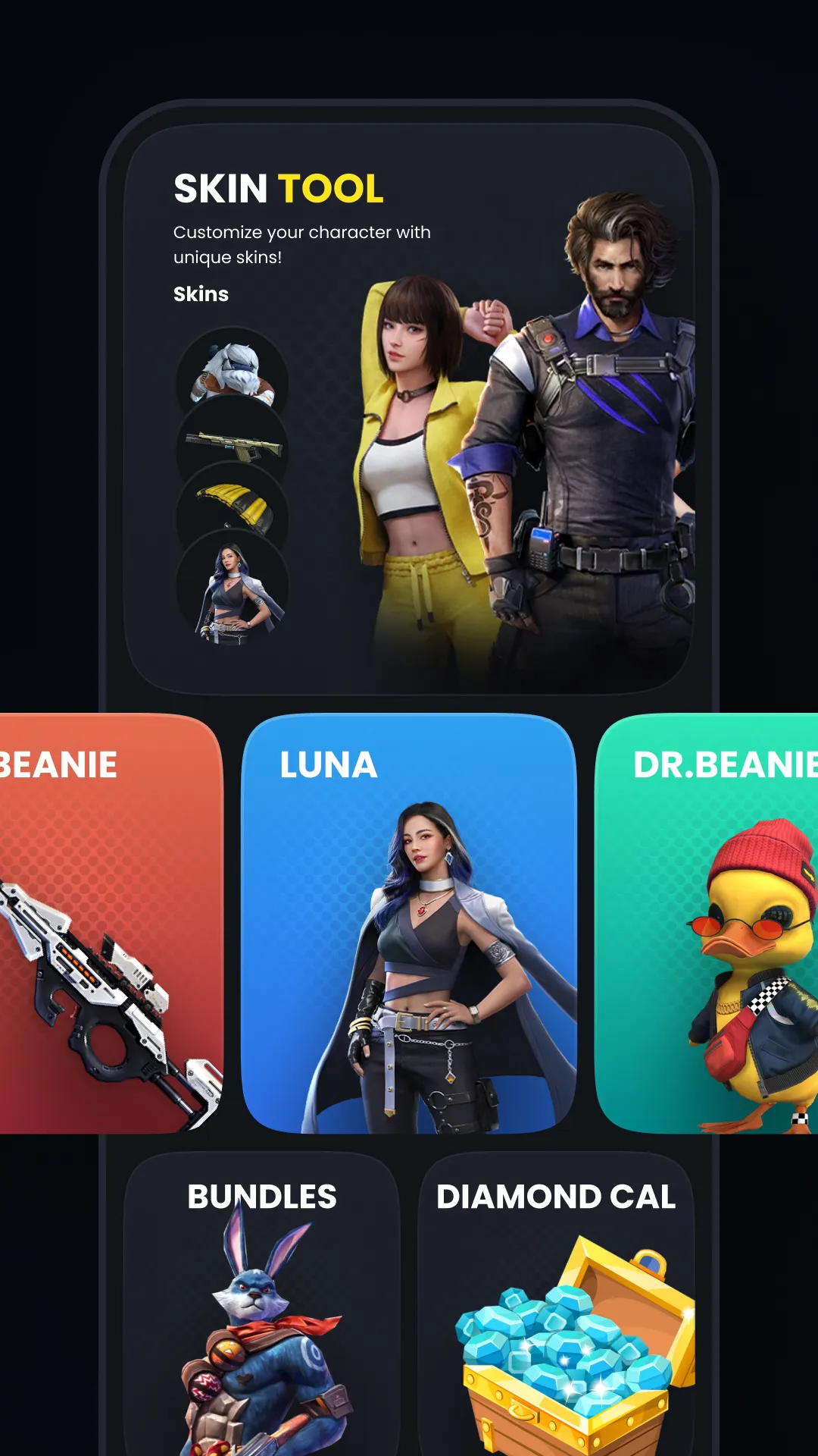 FFFFF Skin Max Tool is a fan-created entertainment app made for users who enjoy exploring creative outfit concepts and visual style ideas. Dive into an imaginative world of fictional skins, emotes, and cosmetic previews—crafted purely for fun and inspiration. Key Features: - Discover creative character style inspirations - Browse fictional weapon skins and parachute concepts - Preview fun and stylish emote combinations...