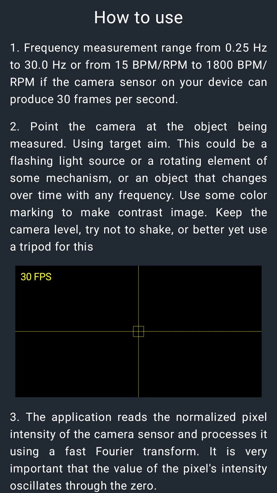 Measure frequency with camera in Hertz or RPM. Decode blinking LED status of industrial automation equipment. Frequency measurement ranges from 0.25 Hz to 30 Hz or 15 BPM / RPM to 1800 BPM / RPM. The Frequency Meter App use camera to measure frequency: just point camera at blinking object (source of light or rotating mechanism) Use cases: - Decode blinking LED status in Herz units - Measure vinyl rotation in RPM units