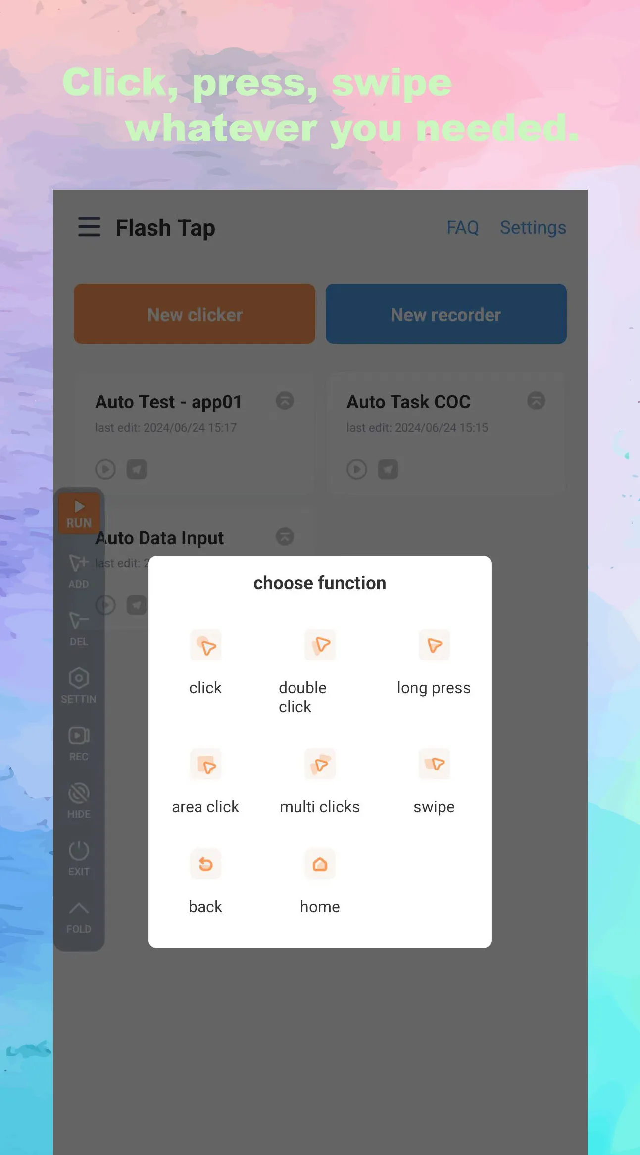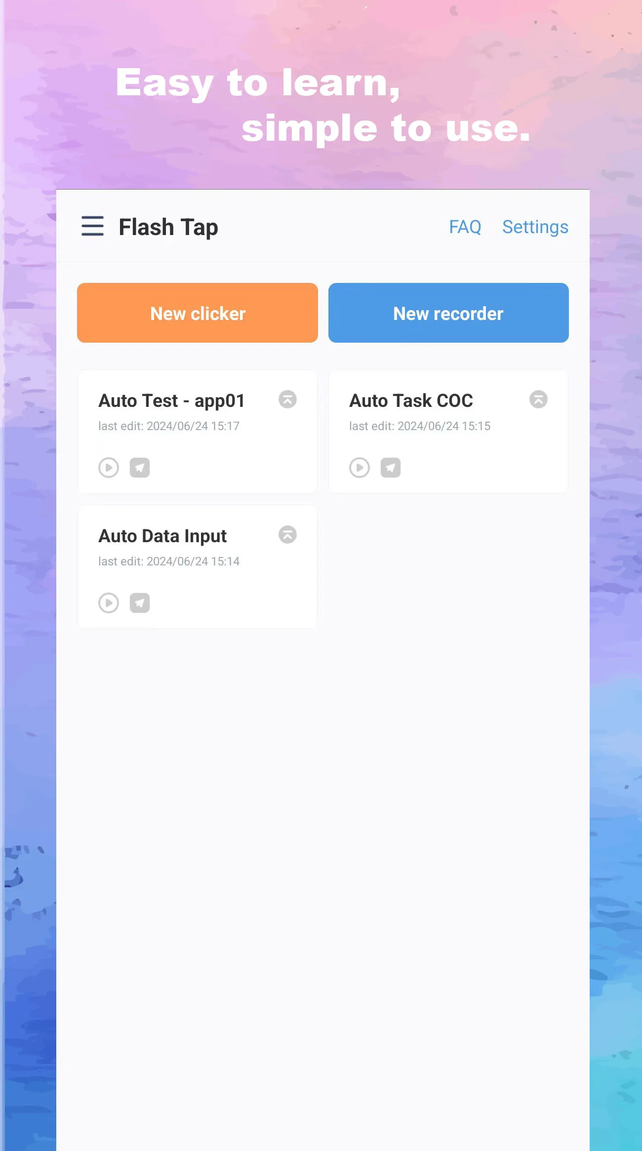 Flash Tap is a powerful and user-friendly auto clicker app designed to automate repetitive tasks on your Android device. Whether you're a gamer looking to enhance your gaming experience ๐ฎ or someone needing to automate routine tasks ๐, Flash Tap has got you covered. Key Features: - Multiple Click Points: Set multiple click points on your screen to automate complex tasks effortlessly with this advanced click automation tool. ๐ฏ - Swipe Support: Automate swipes as well as clicks, perfect for tasks requiring both actions with our swipe automation feature. ๐๐...