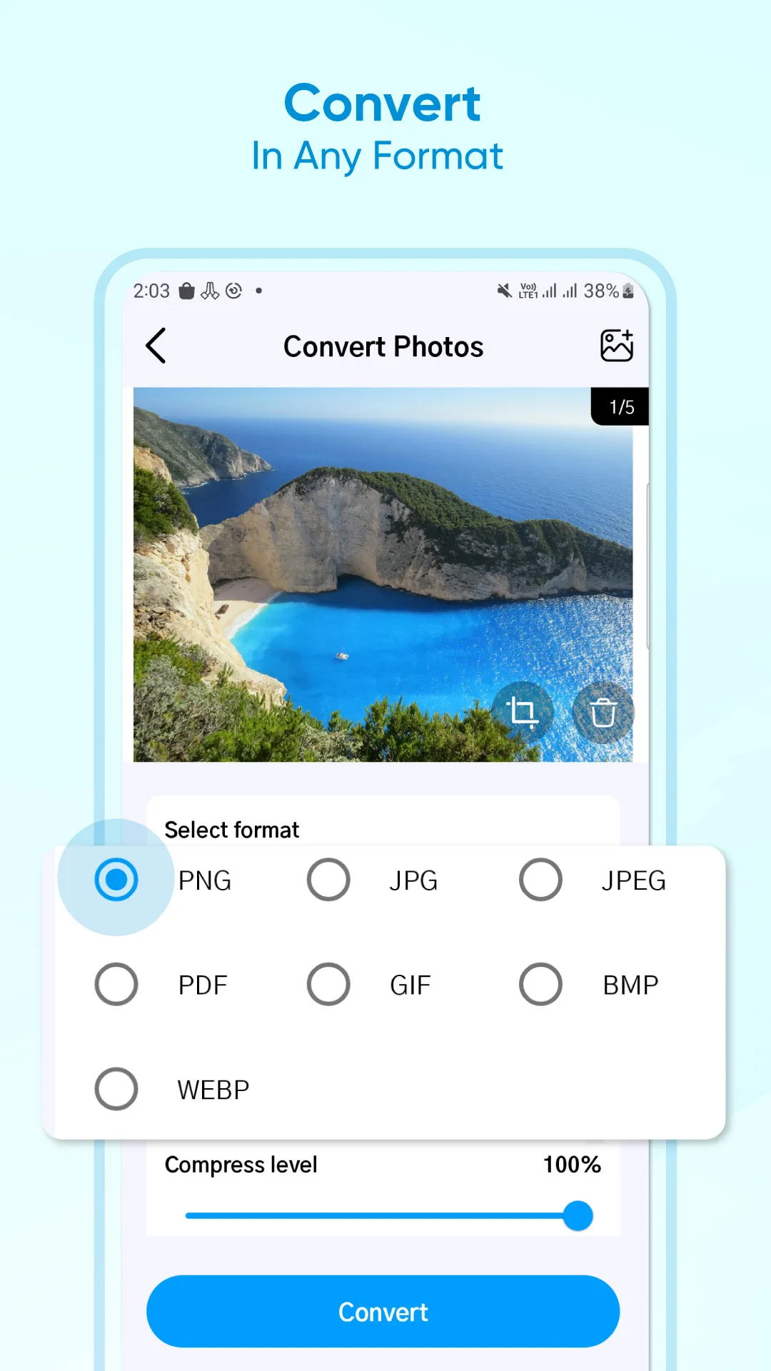 Image Converter - Photo Resize is a tool to convert images into other formats (JPG, JPEG, PNG, PDF, GIF, BMP and WEBP) easily and quickly. In addition, the application also helps change photo size with just a few simple steps. Image Converter - Photo Resize provides the most popular conversions: JPEG converter, PNG converter, JPG converter,.... Any image can be converted to the format you desire. JPEG Image Converter also shows image size to compress JPEG, PNG, PDF or any format to reduce image size and convert. Image Resizer for Android devices is a utility application that allows you to reduce photo size by choosing the appropriate resolution. Photo Resizer is an application designed to help you resize images quickly and easily. The image editor maintains the image aspect ratio by providing a resolution list based on the image's resolution. ...