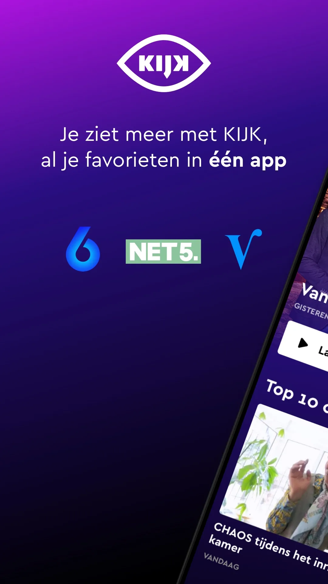 Discover KIJK - Watch your favorite TV programs from SBS6, Net5 and Veronica in one place. Missed programme? With the KIJK app you have free and unlimited access to the best Dutch programs from SBS6, Net5 and Veronica. Whether you're on the road or sitting on the couch at home, with KIJK you'll never miss an episode again. Download the free app today and dive into a world of entertainment. What does the free KIJK app offer?...