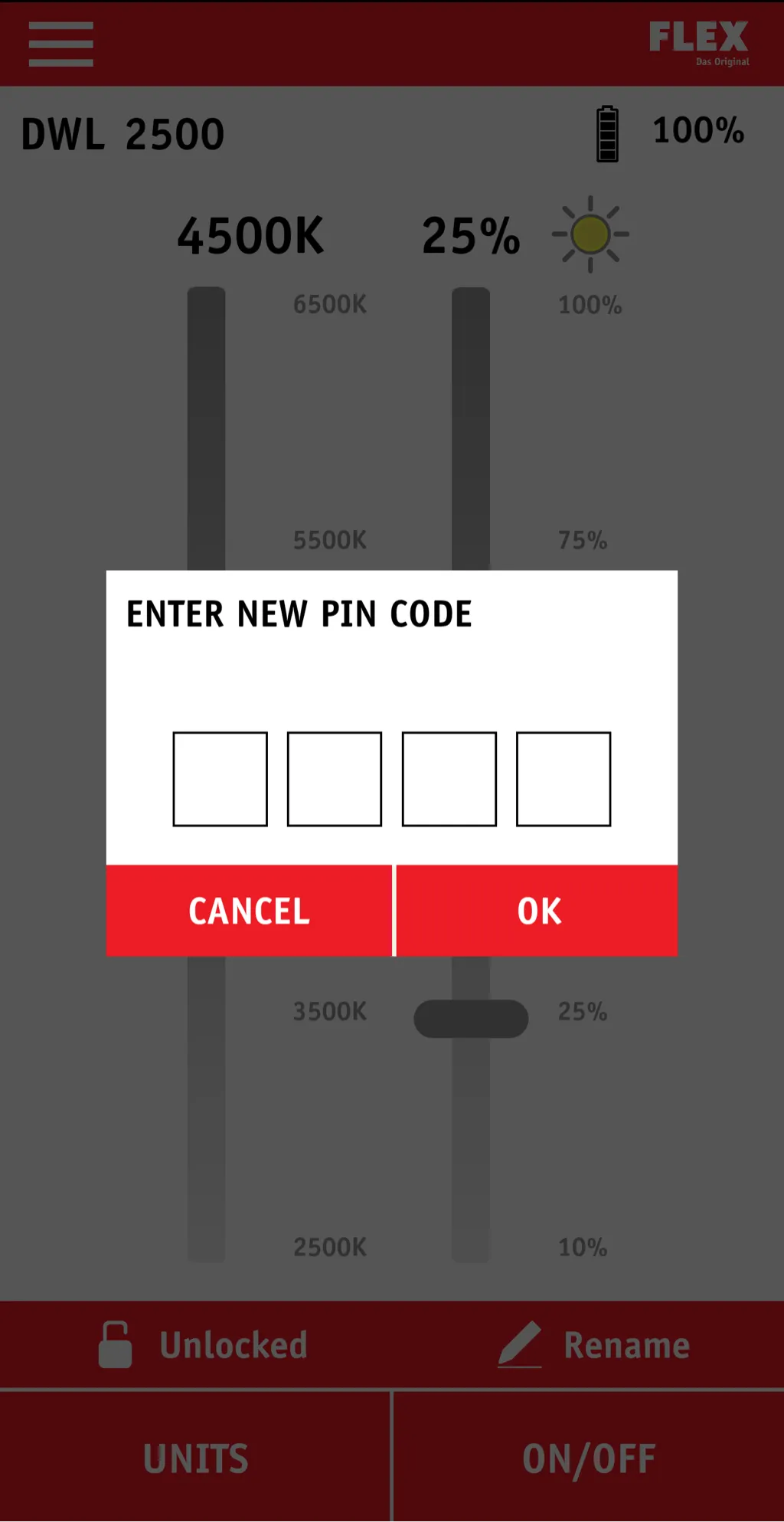With the FLEX LightControl app you can easily connect your FLEX DWL 2500 lamp to your smartphone. Switching the lamp on and off, dimming and much more is thus easily and conveniently controlled. MAIN FEATURES - Switch on/off - Setting of 5 different levels for dimming: 10%, 25%, 50%, 75%, 100% - Setting of 5 different levels of colour temperature: 2500K, 3500K, 4500K, 5500K, 6500K...