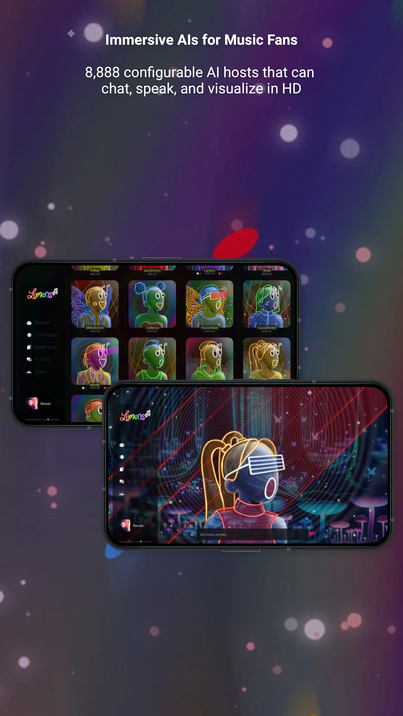 Finally, AI-powered digital assistants that know how to have a good time. Introducing Lumens AI from Vibes + Logic and powered by OpenAI’s ChatGPT. Just pick a Lumen you vibe with and it can be your wild best friend, your personal assistant and your, well, everything – all in one app. Unlike most AIs that get boring at blazing speed, the Lumens are configured for productive fun. Forget dull conversations, and step up to endless entertainment with this highly advanced digital toy for grownups. After all, a Lumen is your own personal supercomputer. It’s an entertainer. A chef. A therapist. A coach. And an expert on any topic you pick. Okay. You get the point. A Lumen can do it all. At genius level. Have fun out there. This is everything AI should be. Your Hilarious Bestie Strike up a conversation with an AI-powered Lumen that’s designed for fun. All we can say is, expect the unexpected....