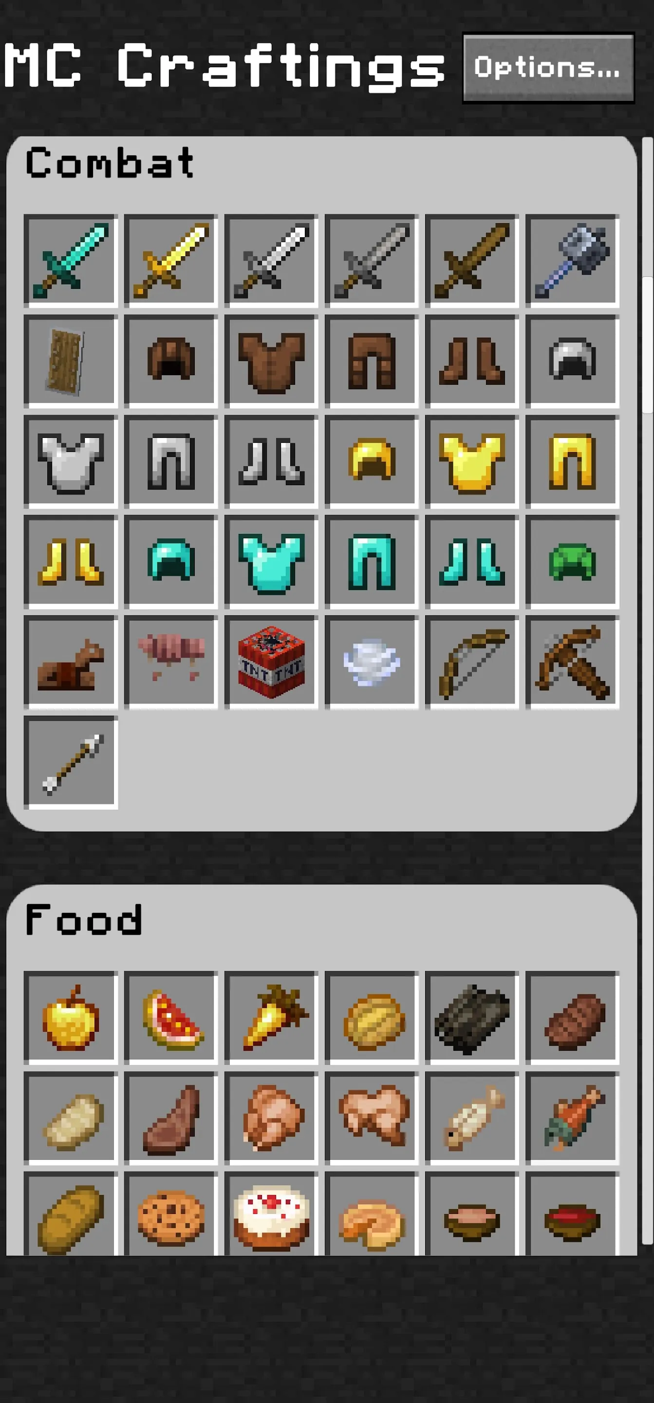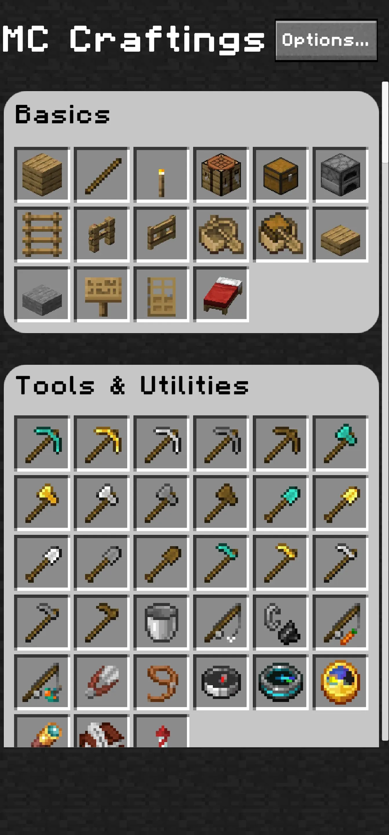 MC Craftings - Your Essential Minecraft Crafting Guide for crafting recipes MC Craftings is the ultimate app for Minecraft fans, designed to provide easy access to every craftable recipe in the game. With a vast recipe library which is accessible offline. MC Craftings is your go-to crafting companion, making it easier than ever to gather resources, craft items, and enhance your gameplay. 🌍 Complete Recipe Library Discover every Minecraft crafting recipe in one place, from essentials like tools and weapons to advanced items like potions and enchanted gear. Each recipe includes detailed images, a list of required materials, grid layouts, and tips on item uses and durability, helping players of all levels craft with ease....