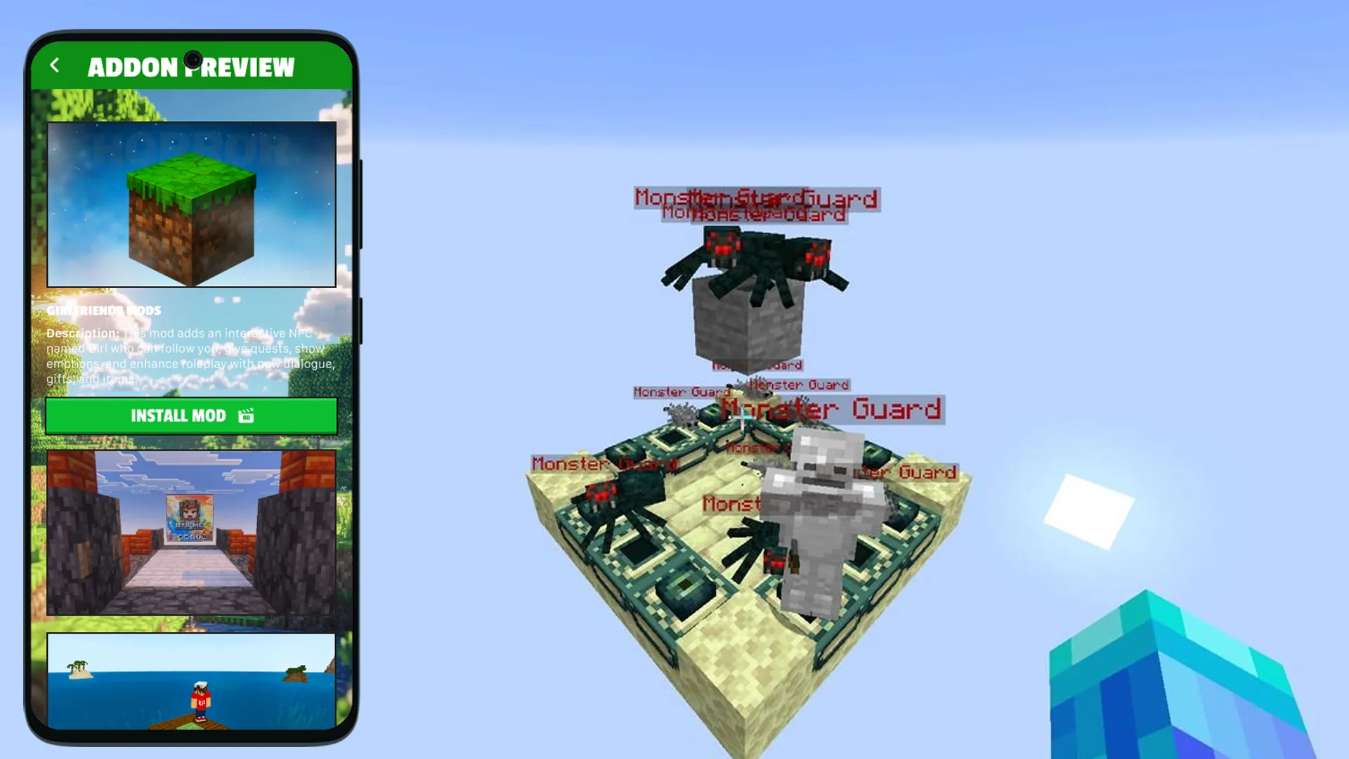One Block Horror for Minecraft Pocket Edition - This is a legendary survival map but with a complication, now you will be prevented from getting blocks and developing your island by creepy and scary mobs, they will attack you at the most unexpected moment, be very vigilant and protect yourself from falling from 1 block, because in this add-on you have only 1 life, try this difficult OneBlock mode right now in MCPE. Now the game becomes much more difficult and interesting because when you launch the world you appear on one block in the sky and it will be night, you have to get the minimum blocks as quickly as possible to equip the island and build yourself a shelter because monsters appear and attack very quickly, dweller and other creepy mobs such as herobrine or parasites, prepare for a battle with them to complete the legendary map. The One Block Horror mod adds a creepy difficulty mode to the game, the night lasts longer with each new stage, mobs will appear more and more often, the chance of defeat is maximum and all this with 1 life. This is the most hardcore survival mode you have ever played ...
