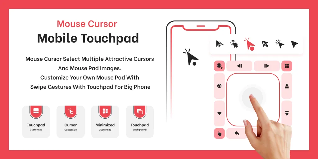 Mouse Cursor Mobile Touchpad application helps to enable mouse pointer or Cursor and touchpad on phone screen to handle action in phone. Easy to move the mouse cursor and touchpad on phone screen with touch click or button click. You can customize mouse cursor and touchpad with solid color, gradient colors, amazing HD backgrounds and GIF animation on touchpad background. Customization mouse touchpad for big phone helps to adjust cursor and touchpad area as your requirement. You can adjust the cursor and touchpad as your needs....