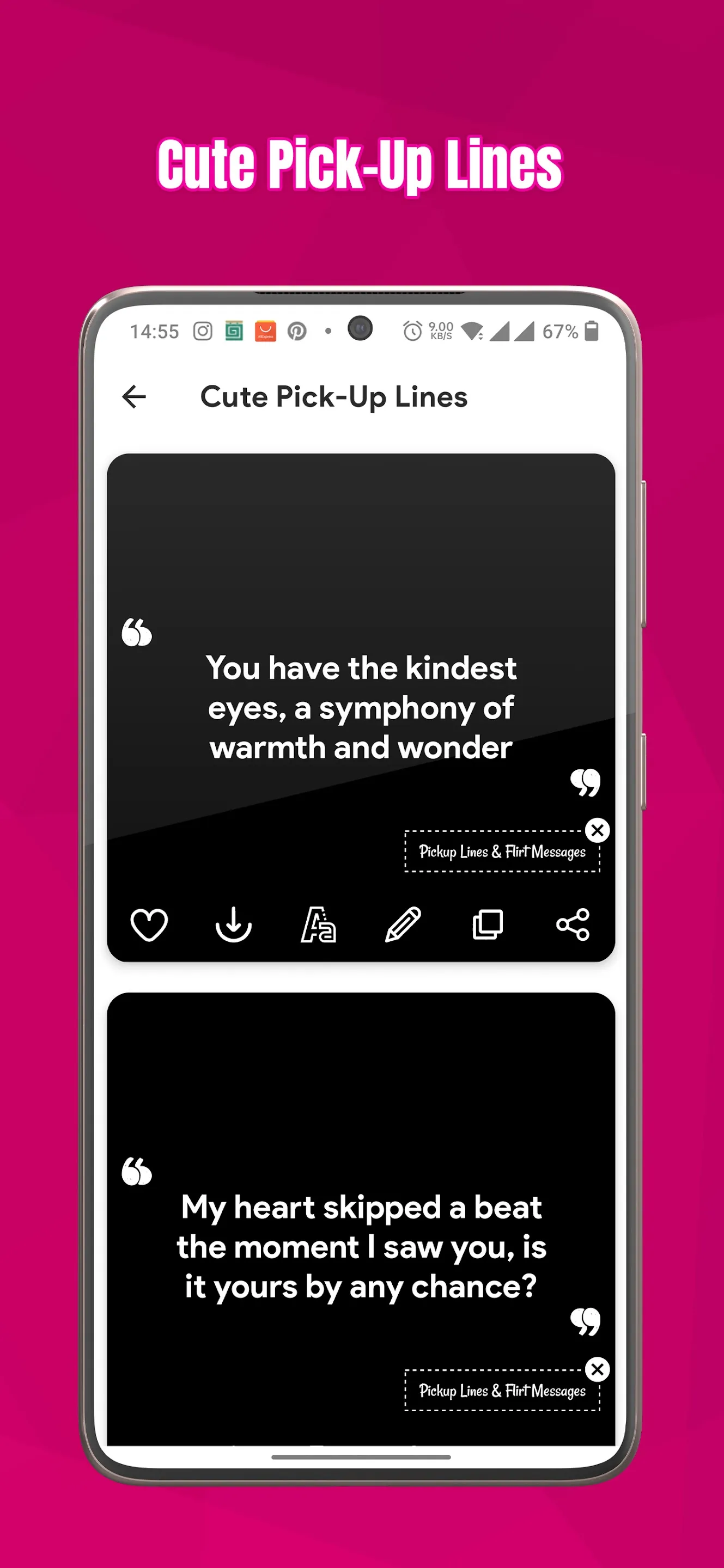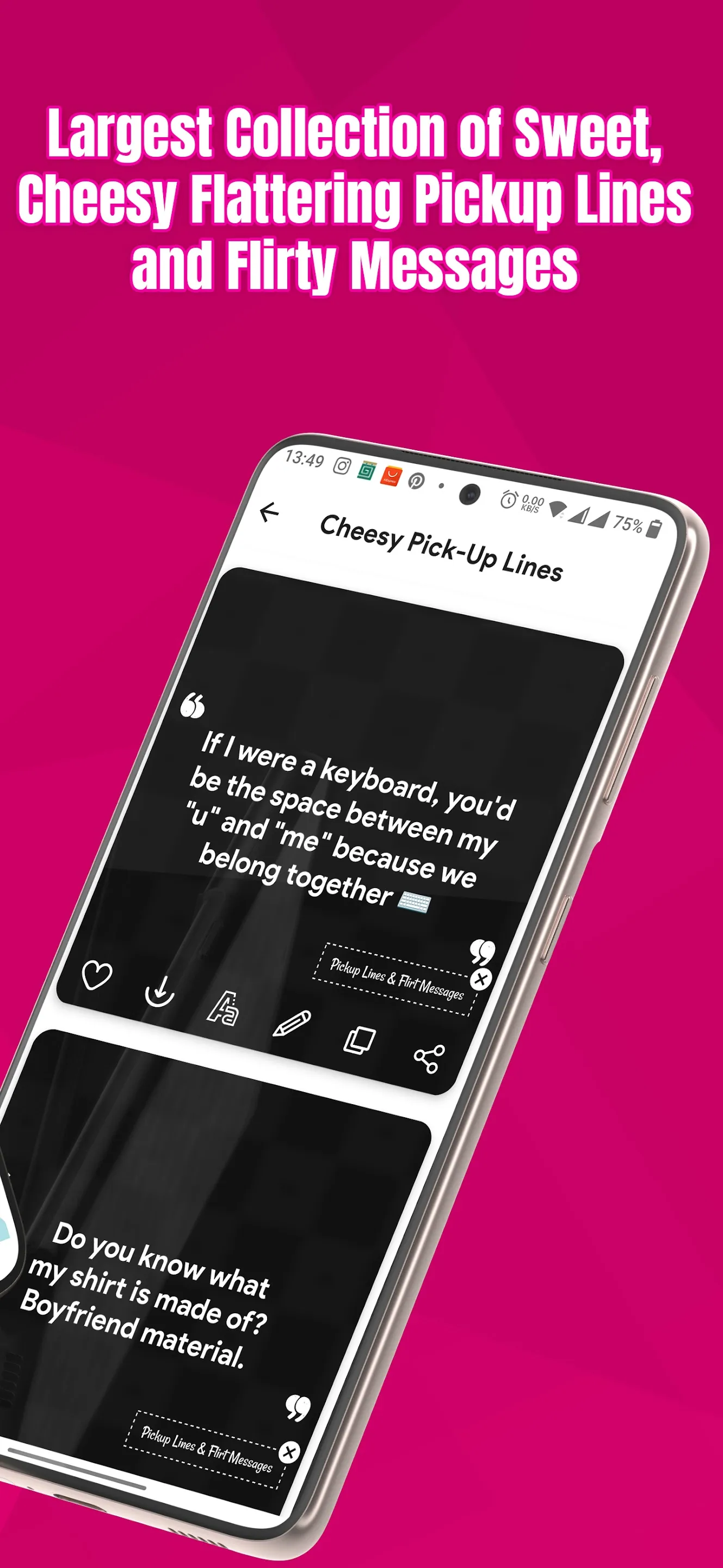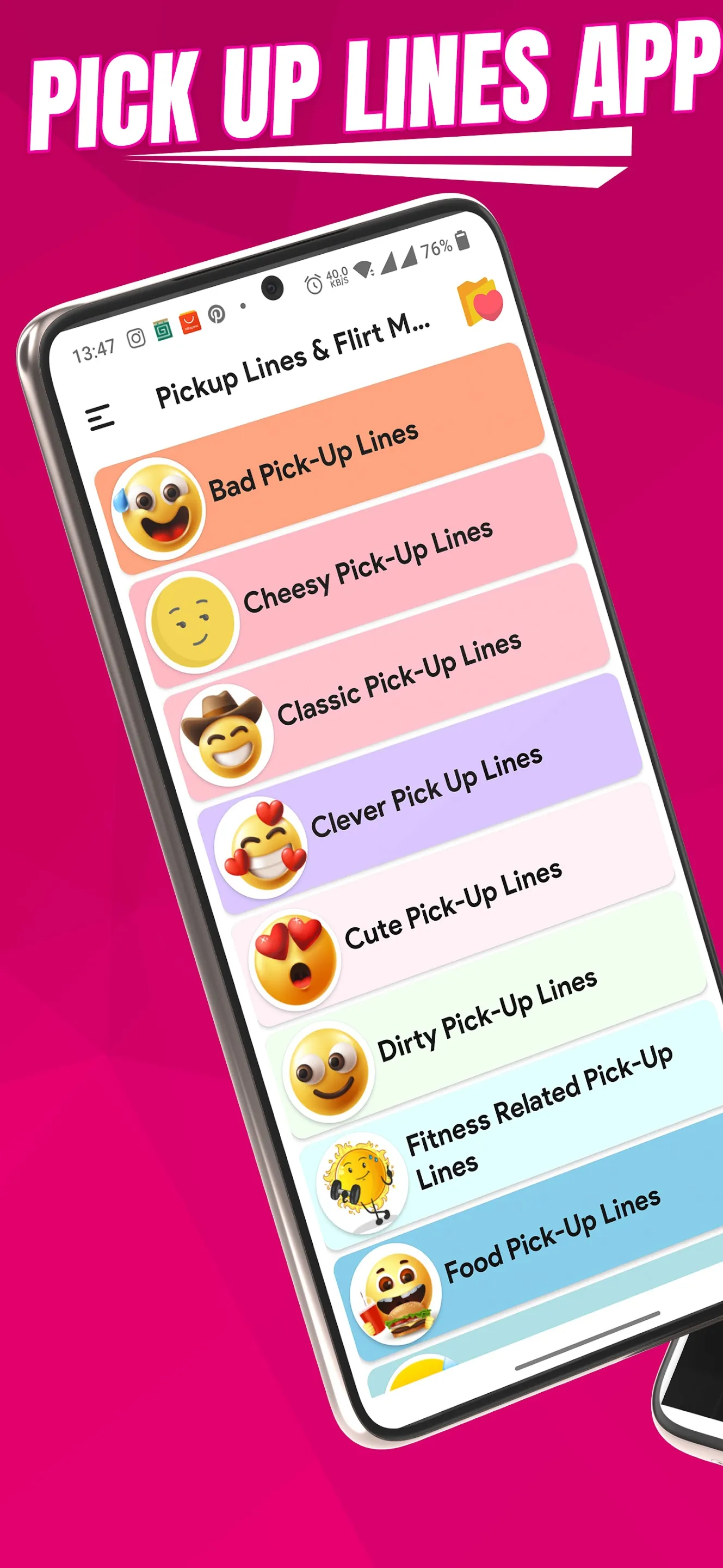 Are you looking for the perfect words to impress your crush? Do you want to spice up your conversations with some flirty fun? Do you need some inspiration to create your own romantic messages? If you answered yes to any of these questions, then this app is for you! 😍 This app is the largest collection of sweet, cheesy, flattering, and flirty pickup lines and messages that you can use to make someone smile, laugh, or blush. Whether you want to break the ice, compliment, tease, or confess your feelings, you will find the right words for every occasion. ...