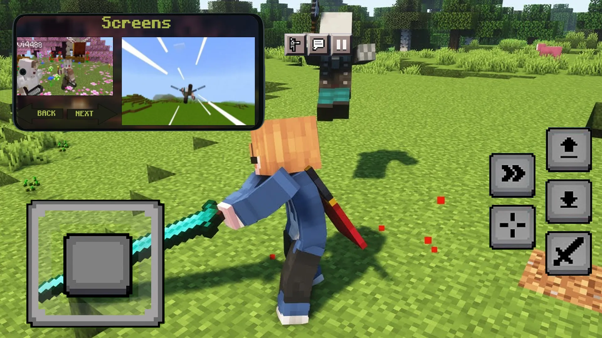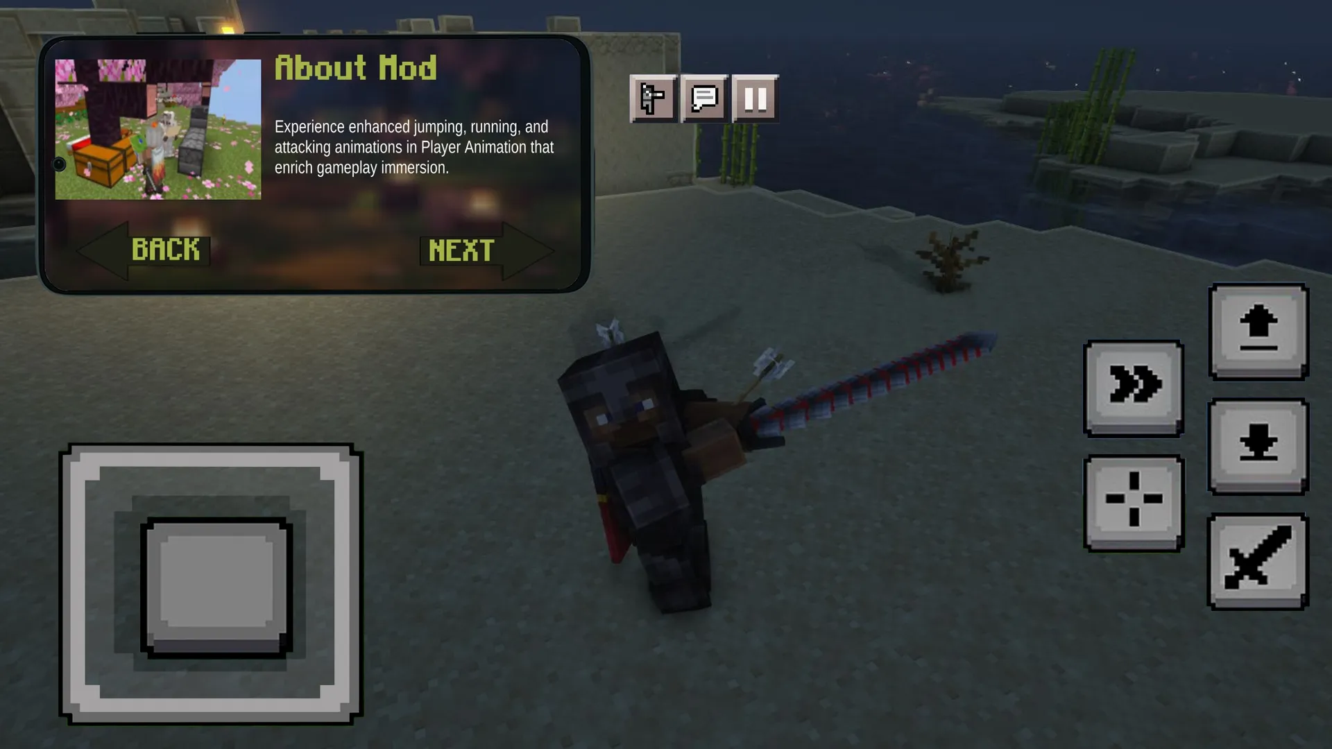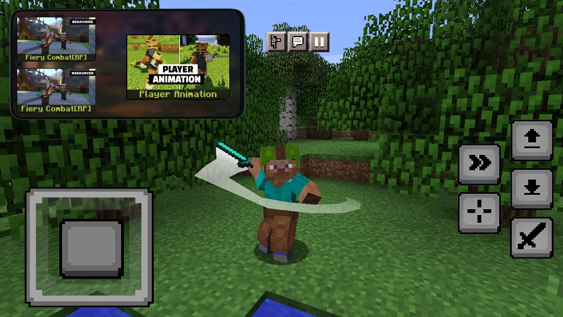 Player Animation mods for Minecraft Pocket Edition - With this mod your movements will become more lively and dynamic, hitting, walking and even swimming look like realistic, try and you new animations for the character in the world of MCPE, also this mod is very well detailed and compatible with other skins that you can download and install from our application. This Fresh Player Animation addon is a set of resources that completely changes the behavior of the player, each part of the body becomes dynamic and alive, running, walking and even the swimming mode looks as epic and detailed as possible, enjoy new textures and animations right now with cool mods and skins. The most important thing is that the application has other mods that will change your vanilla world of mcpe, namely, they add animations not only for the character, but also for other mobs, they become like living ones, animation of eyes, arms, legs and even walking, all mobs have individual animation and its stages. ...