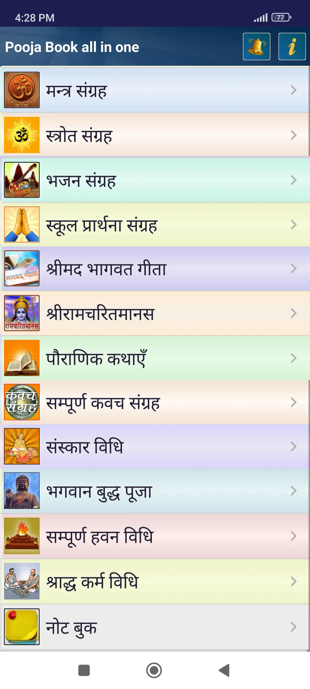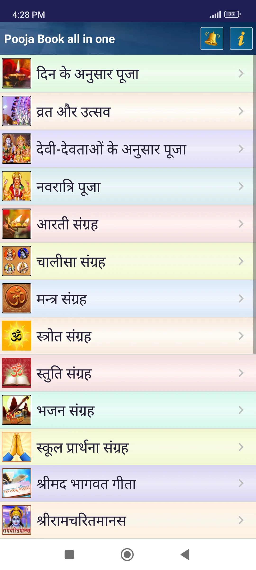 A Free all in one Android App of Hindu Pooja Book in Hindi that includes all collection of Aarti Chalisa Mantra Fasting Vrat katha Hindu Festivals Puja bhagwat geeta ramcharitmanas and more. This is a Complete Pooja Book containing worship methods and stories aarti chalisa and mantra of all hindu Gods and Goddess. This Book also contains prayers for all sanatan festivals and holi occasions. This app also contains all chepters of shrimad bhagwat geeta and all Kaands of shri ram charit manas. To simplify the usability, the contents and topics have been arranged in various categories such as: Pooja According to days...