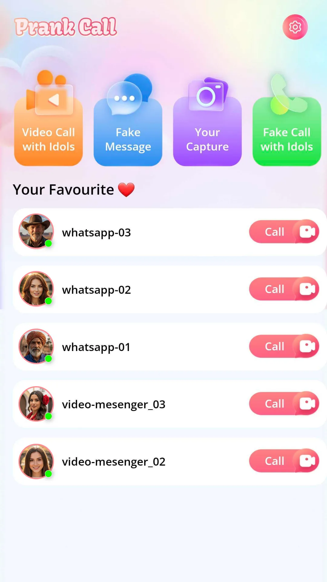 Prank App: Idol Video Call Make the impossible look real. Prank App: Idol Video Call lets you stage hyper-believable video calls, voice calls, and chat threads with idols and characters—perfect for laughs with friends, party reveals, and viral shorts. 📱🎭 What makes it irresistible Look-alike call motion: Animations and UI that mirror popular calling apps—front/rear cam switch, mute, speaker, end call....