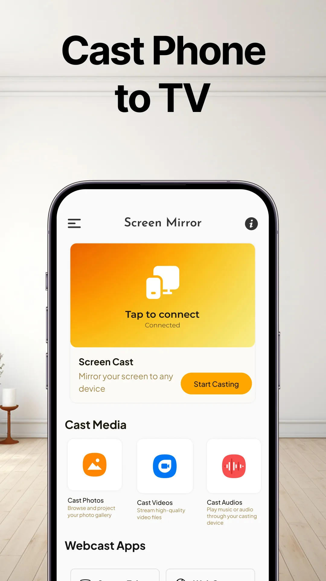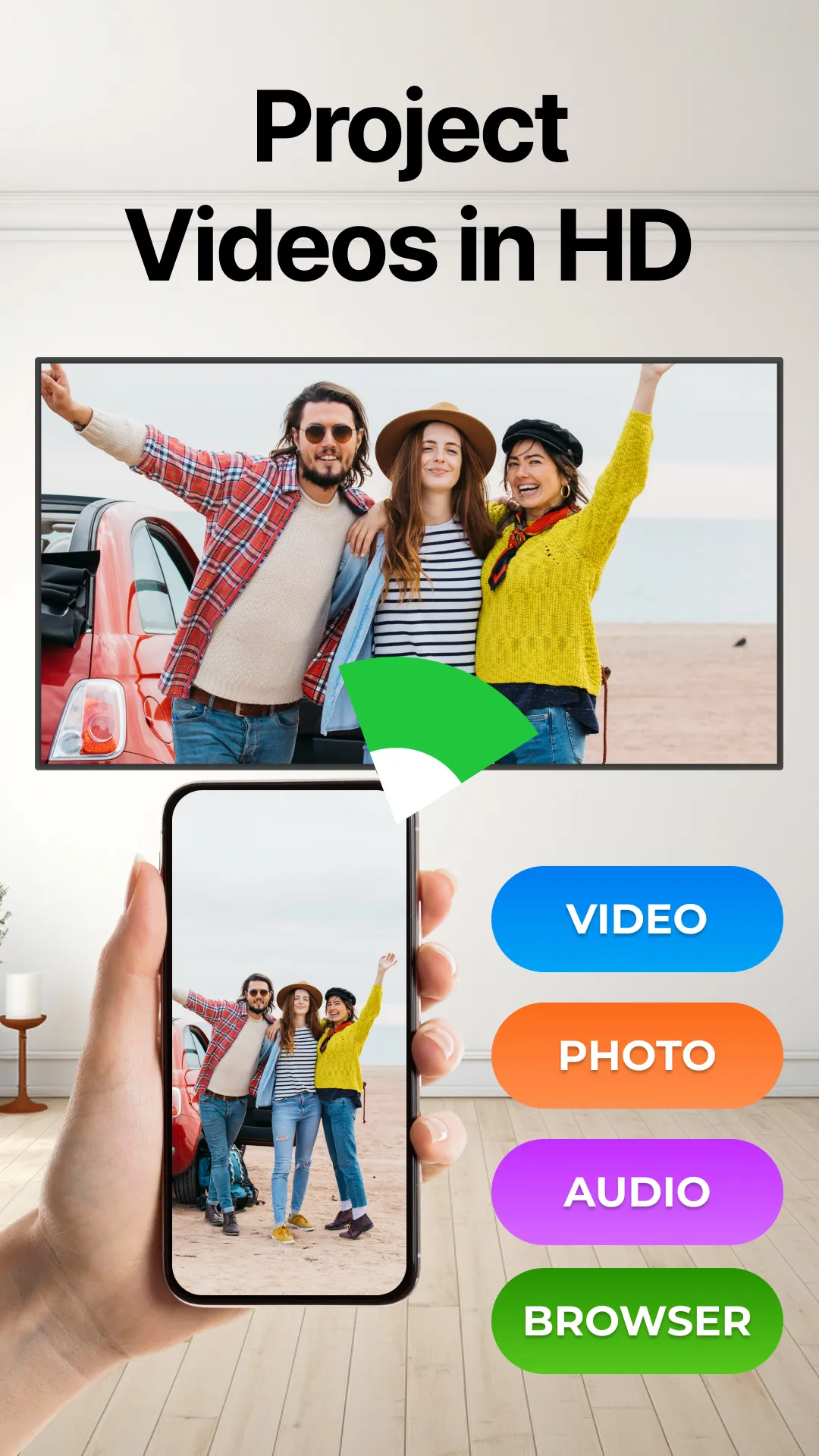 The Projector - Screencast to TV App is a mobile screen mirroring app that lets you cast your phone screen on your Smart TV in high-quality. With the TV Cast app, you can cast your music, local photos, videos and online videos on the smart TV. You can also cast your favorite TV shows, live streams and play games on the big screen. Screen mirror your mobile device to your Home TV and access the device notifications while using this app. This TV Cast & mobile screen mirroring application is suitable for: ...