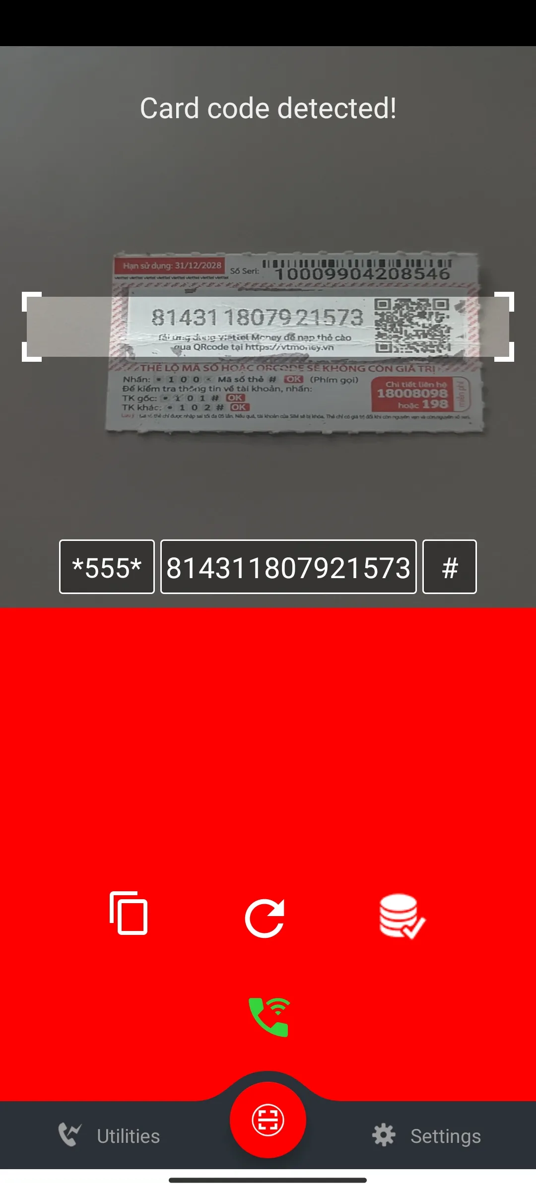 Kscan: Recharge Card Scanner (old name is ksScan) - help you Scan recharge card and TopUp your phone quickly. Scratch the overlay on the card, open the app and put the camera in the code container, the app will automatically scan and display the code on the screen. You can Copy or Top-up right away. * In addition, the application also supports: + Scan from images in the gallery + Save card code list and export to excel file (Premium version) ...
