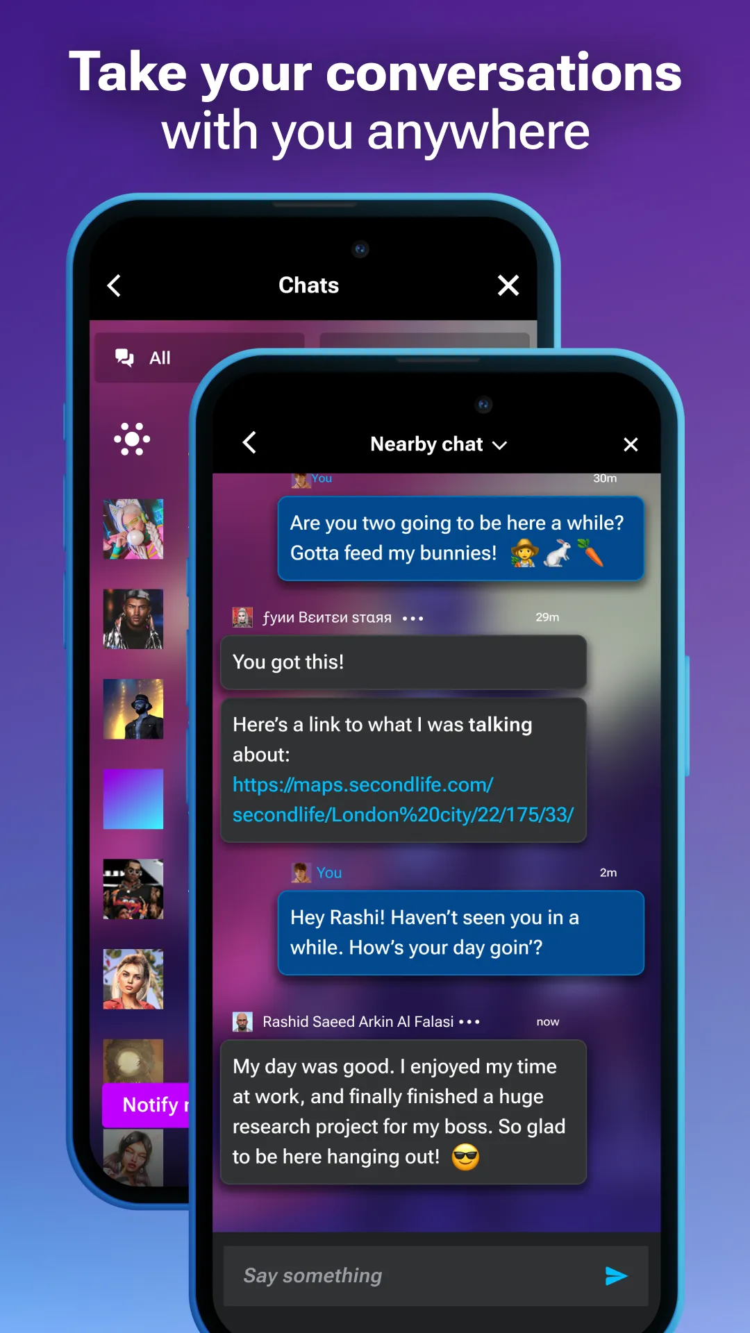 The Second Life app - now in Beta! - brings the richness of the Second Life virtual world to your mobile device. Experience a new level of convenience and engagement in your Second Life adventures, whether you’re at home or on the go. Available and free to everyone! Whether you’re at home or on the go, you'll never run out of places to explore and people to meet. With the Second Life app, you can: * See your avatar & edit appearance by changing outfits * Explore a virtual world of fashion, clubs, art, and roleplaying via the Destination Guide, mobile showcase, own favorites * Interact with the world through avatar movement (walk, run, fly, sit, stand) and object interactions (touch, sit) - or park your avatar and explore via flycam...