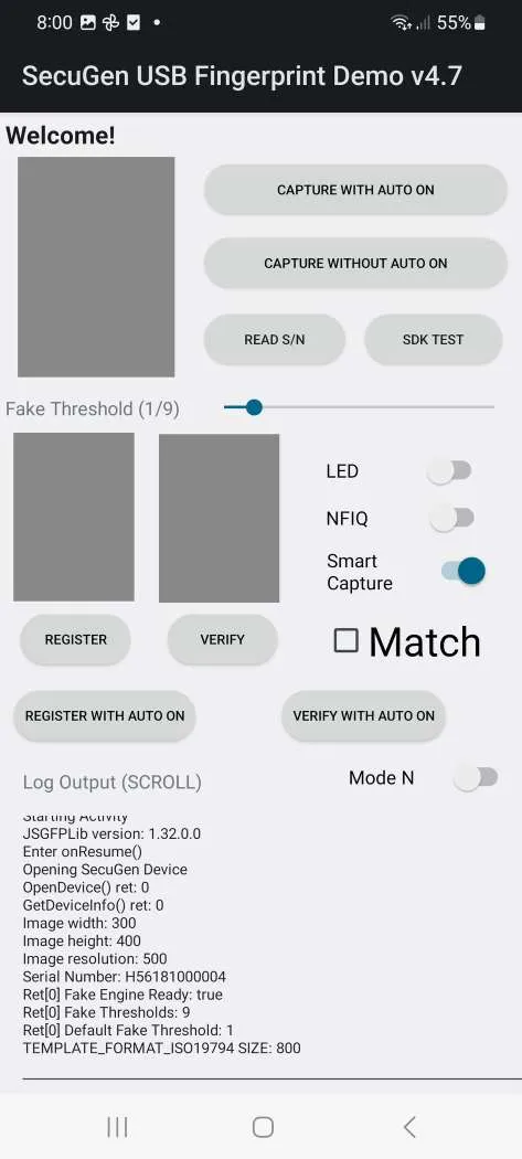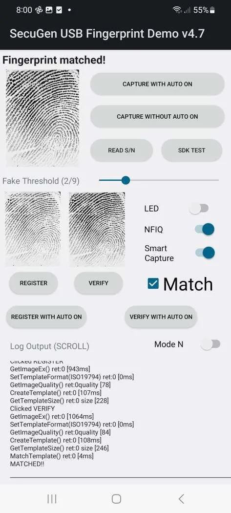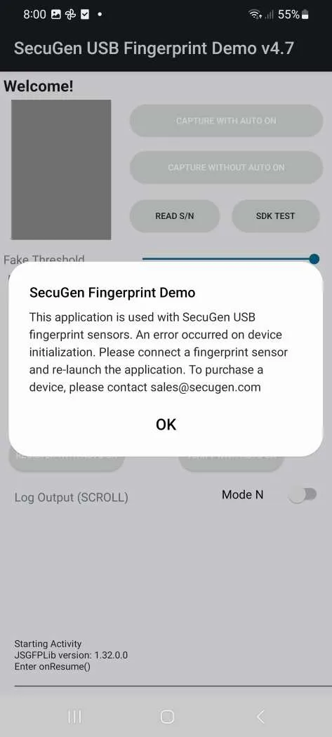This application can be used with the full range of SecuGen USB fingerprint readers The application provides the following functions to demonstrate how the SecuGen fingerprint readers may be used in a biometric application: - Connect fingerprint reader to a mobile device. - Scan and register fingerprint - Verify with fingerprint...