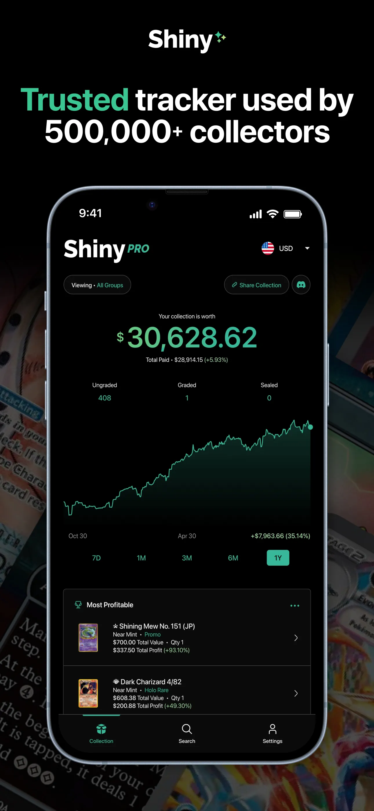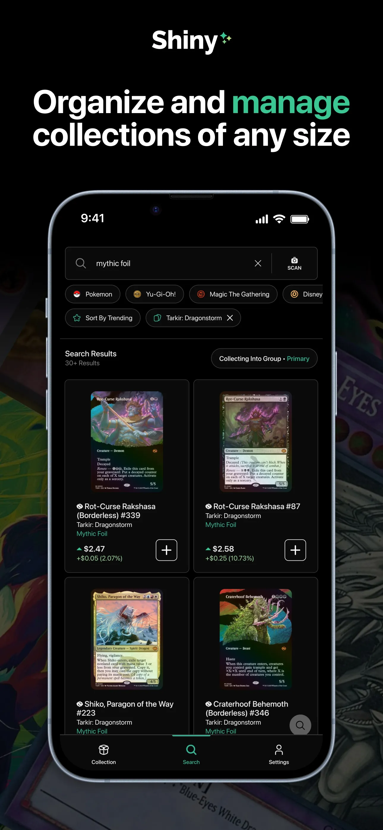 The ultimate Pokemon card value scanner and TCG collector app! With Shiny’s fast and accurate card scanner, you can instantly value and organize everything from Pokemon, MTG, YuGiOh!, Disney Lorcana, One Piece, and more. Our massive database of 300,000+ trading card products helps you discover, organize, and track your entire collection across all major collectible games. KEY FEATURES • Card Scanner - Instantly scan and value cards across all major card games. • Price Alerts - Set alerts for price changes on singles, sealed products, or slabs....