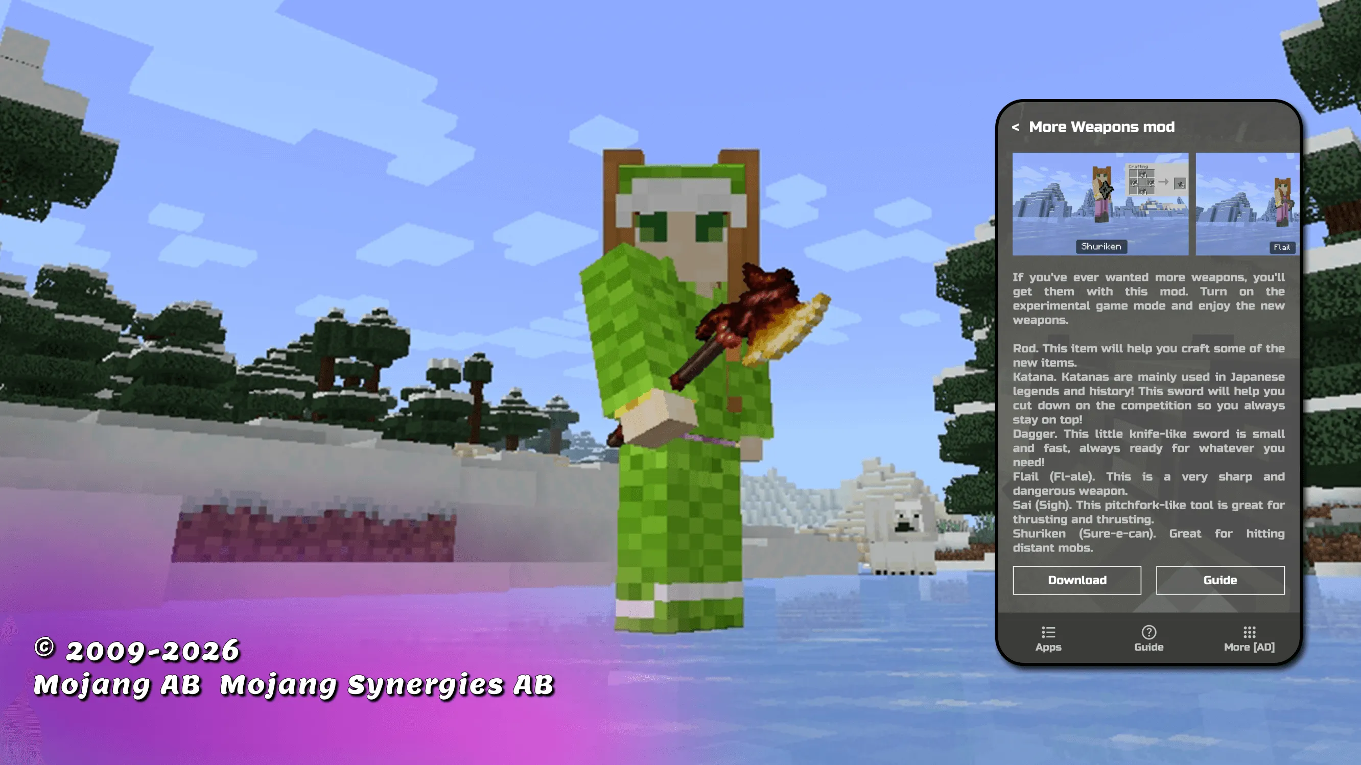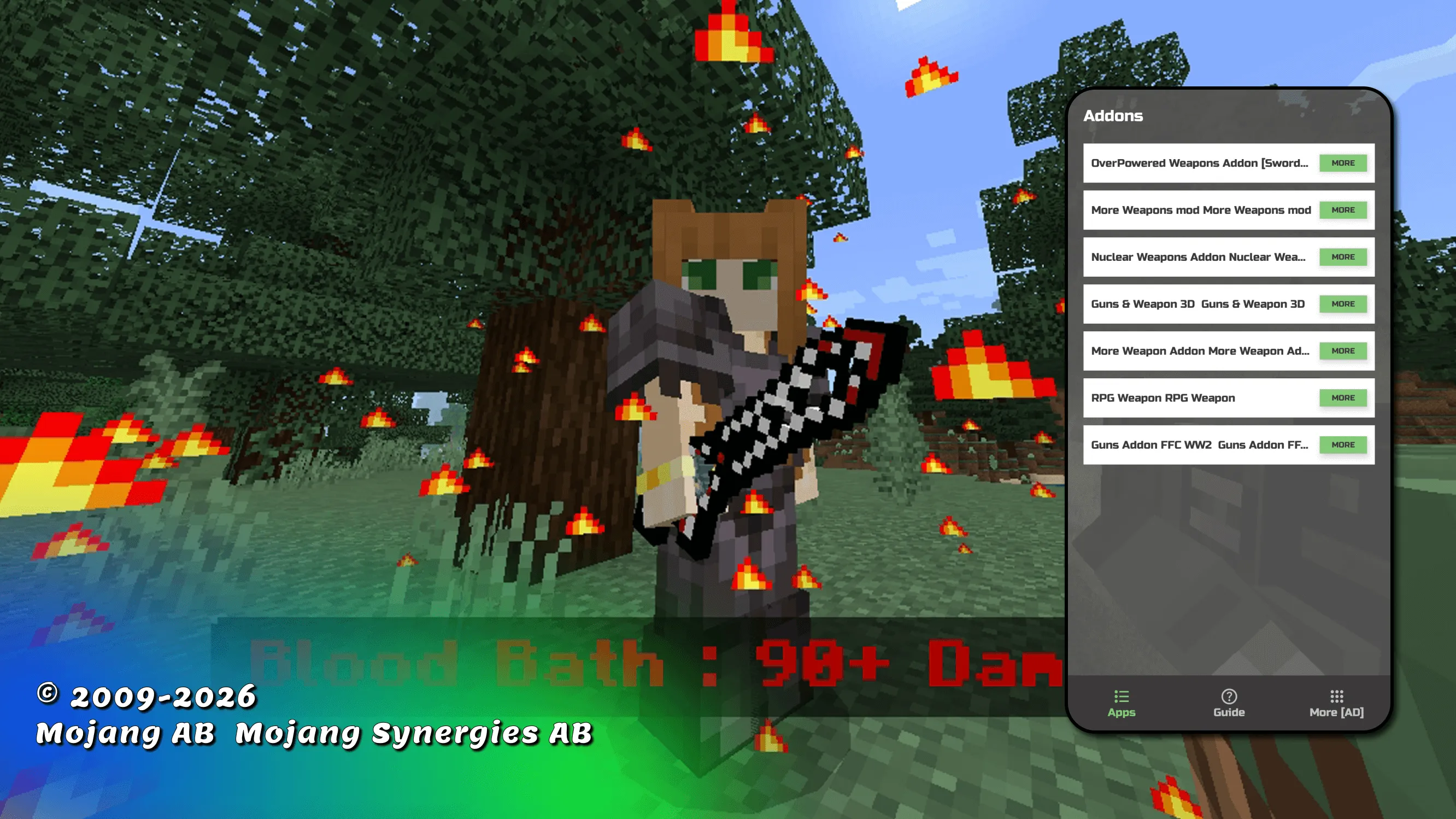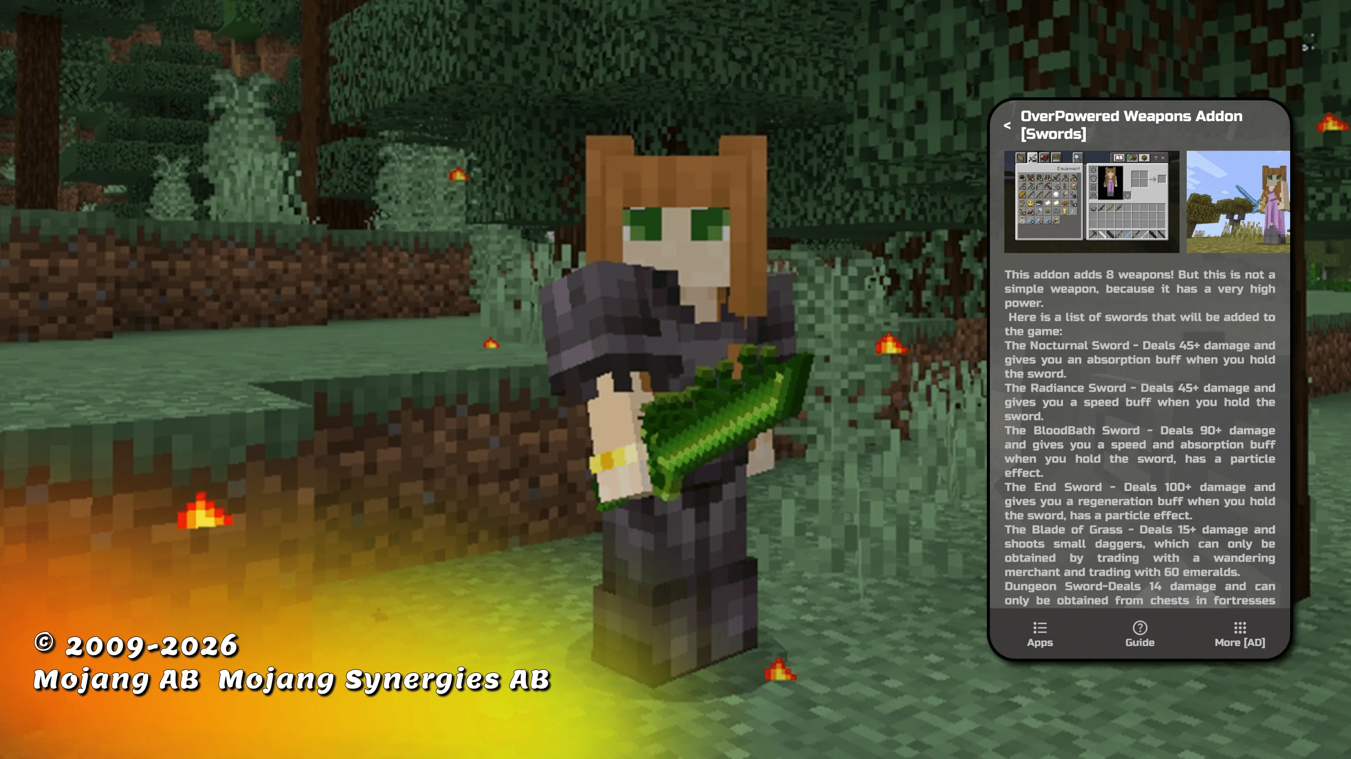Are you tired of putting up with the fact that there are very few sword and weapon mods in the game? Do you want to get powerful weapons for mcpe and new types of sword mods in your game? Stop putting up with it! Come to our account, because we only have working mods for minecraft. Plus, they are very easy to install! With just a couple of clicks you will get a lot of great swords for minecraft and weapon mod for mcpe and you can use it! Let's check how cool and powerful minecraft sword you can get and whether all your friends will like it! Do you want to be the owner of inventory with powerful sword for minecraft? Great! Then you will definitely need our app with guns for minecraft. After all, with the weapon mod you can get incredibly powerful items that you can place in your inventory. All mods and addons will give you an incredible variety of weapons for minecraft. You will never have to use a bow and arrow to defend yourself again. After all, you can use the new sword mod for minecraft. After all, they are much better than the standard weapon and sword mods that you used to use. In addition, it is so difficult and tedious, because this mcpe weapon did not deal such powerful damage. But still, the players have a way out! You can add new weapon mod for minecraft from completely new materials. With sword for mcpe you can be dangerous for all mobs. With this sword mods for minecraft you will definitely be able to stand up for yourself and never be afraid of anyone! If you are tired of the standard op sword mod for mcpe, then it’s time for you to download new ones and not engage in crafting. And you can get all the complicated recipes out of your head. After all, it is the elemental swords mod that will help you simplify your survival. You can get quite a lot of swords mods for minecraft. And you will become the most protected in the game and all your friends will want the same weapon for minecraft! ...