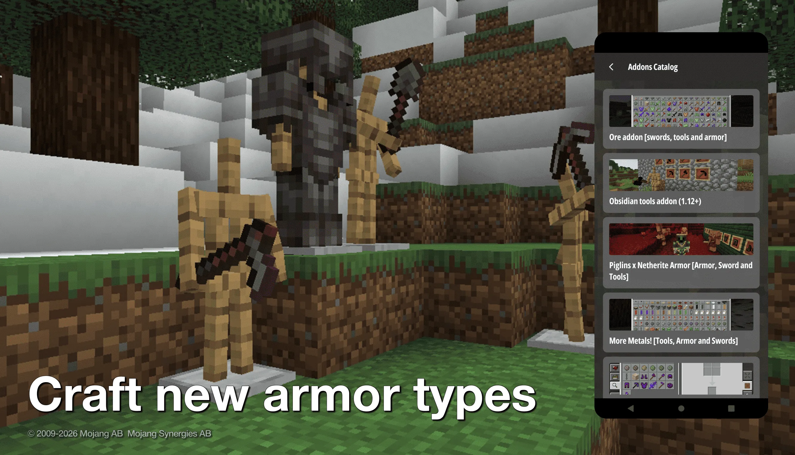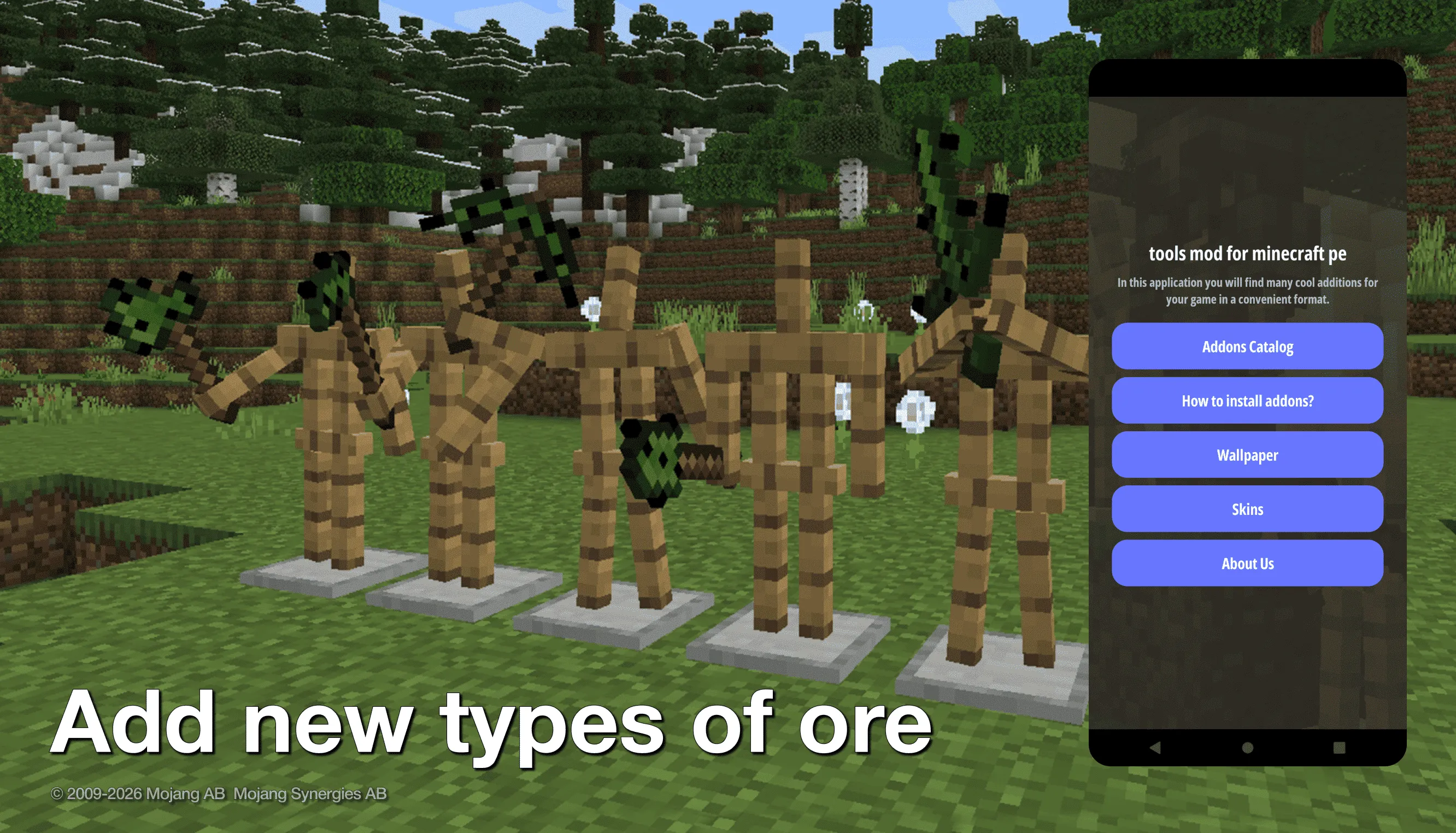 Easy and fast installation, because we only have mcaddon files. No archives that are hard and long to unpack and install! Are you tired of the standard ore mod 1.19 and all the items that you can get from it in the game? Do you want to add new tools mod for minecraft pe and new types of ore mods 1.19? Great! Add mods for minecraft 1.19 and you can easily do it! With the mods for mcpe 1.19 you can become the owner of the largest and most diverse inventory full of tools for minecraft 1.20. Rather, start your game with your friends and surprise them with our minecraft mods 1.19 and a huge selection of swords for mcpe 1.12! What are tools in minecraft 1.19 and how will they be useful in the game? Usually, all players at the beginning of the game are focused on extracting as many different resources as possible. It is with their help that they can get armor for minecraft 1.12, weapons for mcpe 1.19, sword mod 1.20, etc. But the longer the player is engaged in the extraction of resources, the more they get bored with standard ore. But with the tools mods for minecraft 1.12, it can incredibly diversify the game and add various new types of ores plus addon. And, accordingly, get new tools for mcpe and armor mods 1.18. And of course you will get not only minecraft tools 1.19, guns mod for mcpe 1.20 and other items....