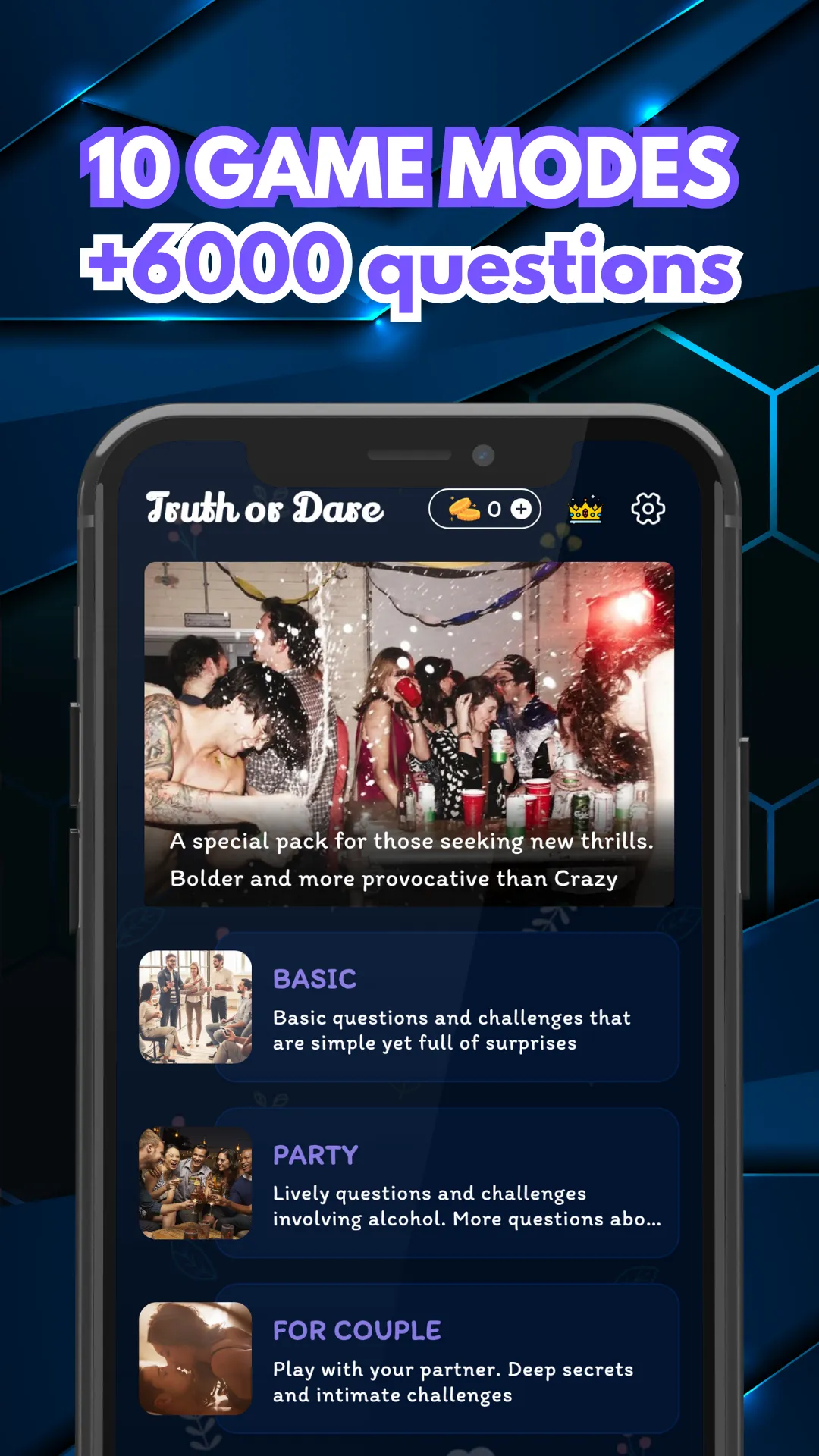 "Truth or Dare - Party Game is the perfect party game to create unforgettable memories with friends, family, or during romantic evenings. With various game modes and customizable options, this app offers fun, exciting, and sometimes naughty challenges that will keep everyone entertained. Get ready for laughter, thrills, and moments that spice things up! 🎉 Game Modes: 🎈 Basic Simple and fun challenges suitable for everyone. Perfect for family gatherings or casual hangouts with friends, creating memorable moments filled with laughter. ...