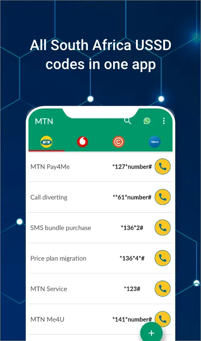 USSD-SA is a mobile application that provides an intuitive human-machine interface to subscribers of all telephone networks in South Africa(Vodacom, MTN, Cell C, Telkom). It allows access to all USSD services available on a particular network without requiring any special memory effort from the users. With USSD-SA, a user is able request a Callback from another contact with respect to the given network by just clicking on a button and picking the contact from his phone book. Below is a list of some of the services you can perform on MTN using this app: -Check your airtime balance -Purchase a data bundle -Access MTN master menu -Data bundle cancellation...