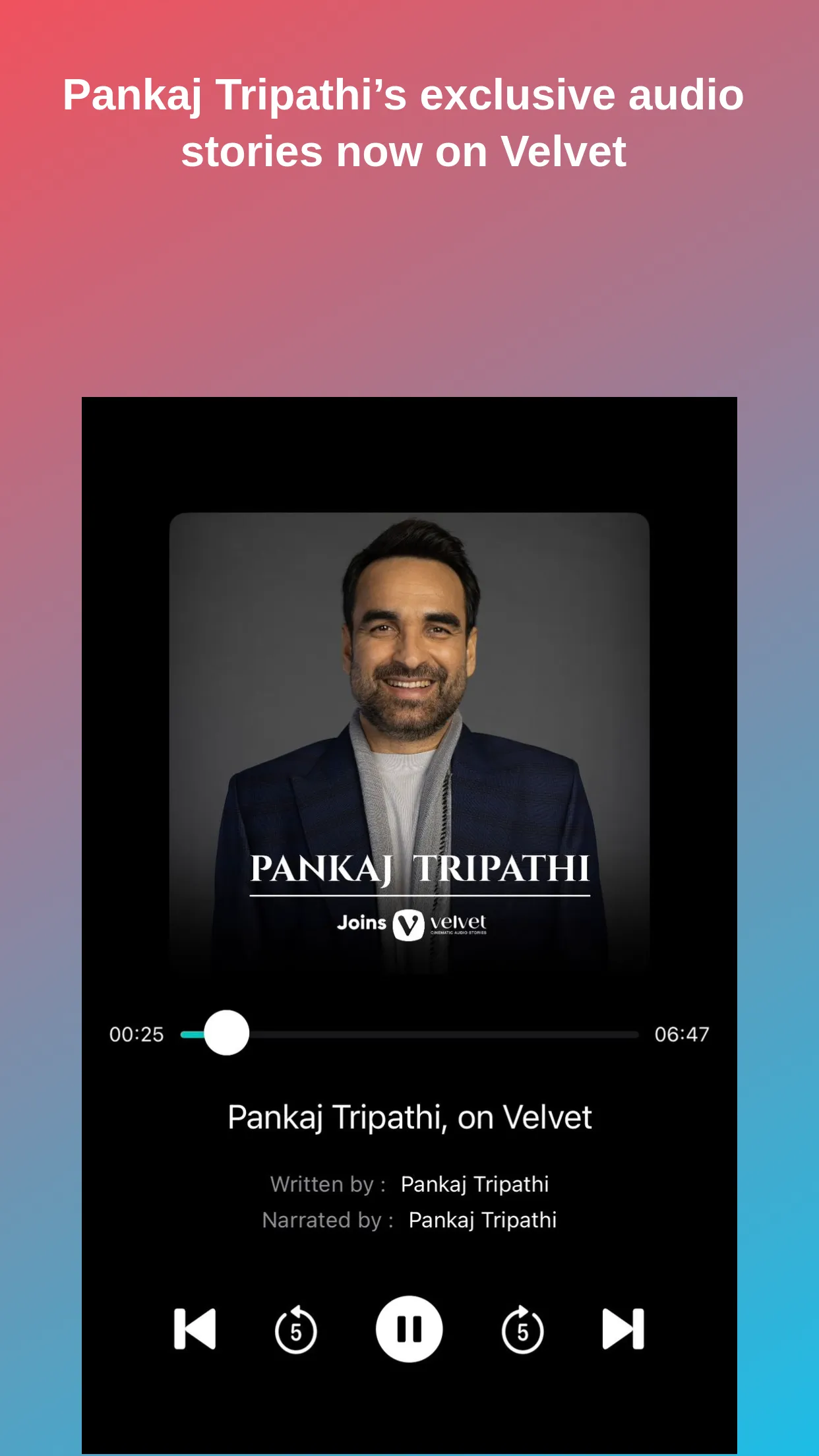 Velvet – Cinematic Audio Stories ft. Pankaj Tripathi 🎙️ Experience immersive audio storytelling with actors Pankaj Tripathi, Vikas Kumar and more! Velvet brings you cinematic audio stories that transport you into gripping narratives, featuring exclusive weekly shows by Pankaj Tripathi. Dive into suspense, drama, horror, and more - crafted with rich soundscapes and powerful performances. ...