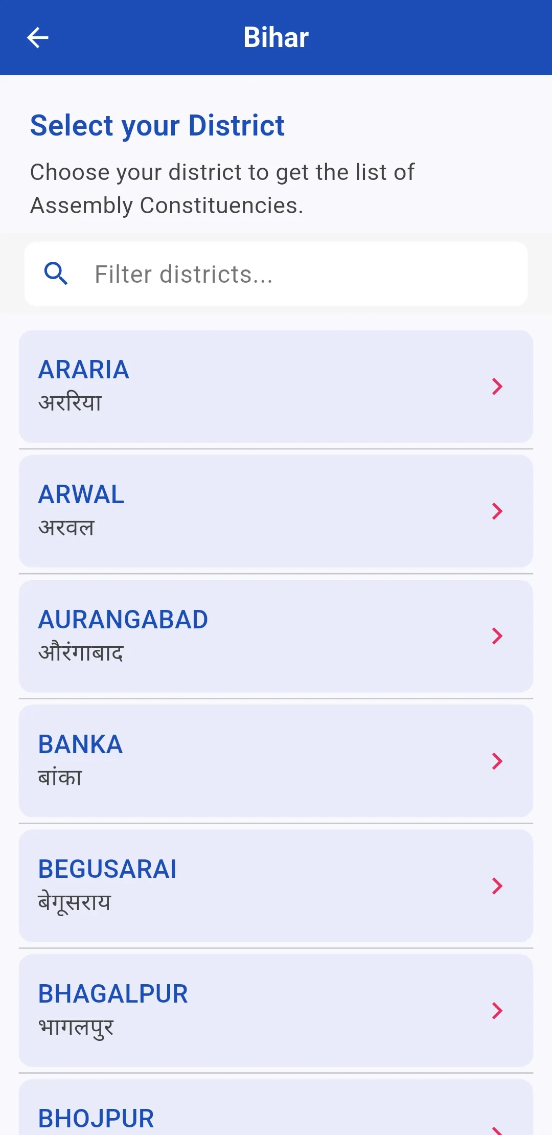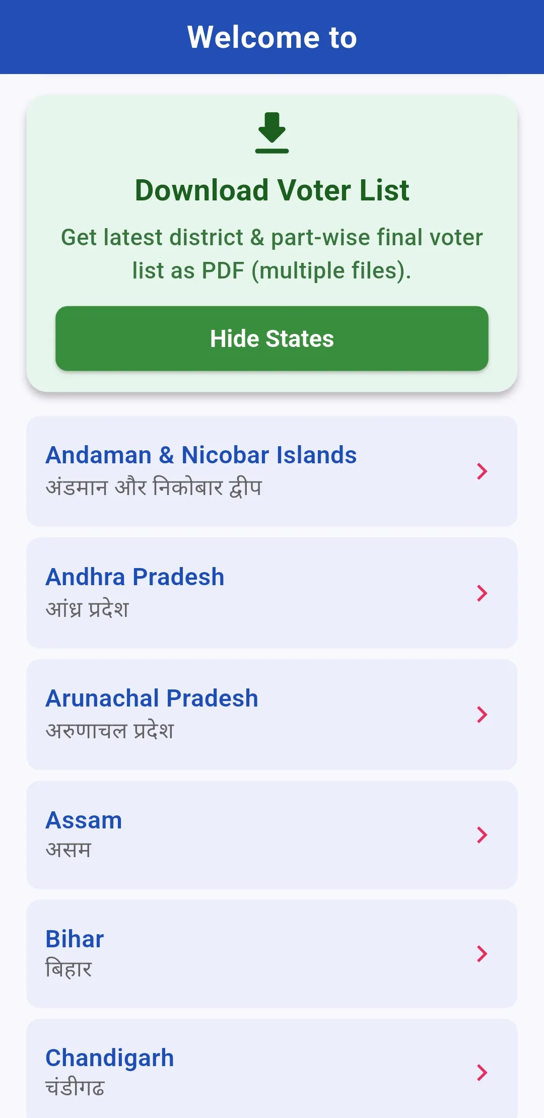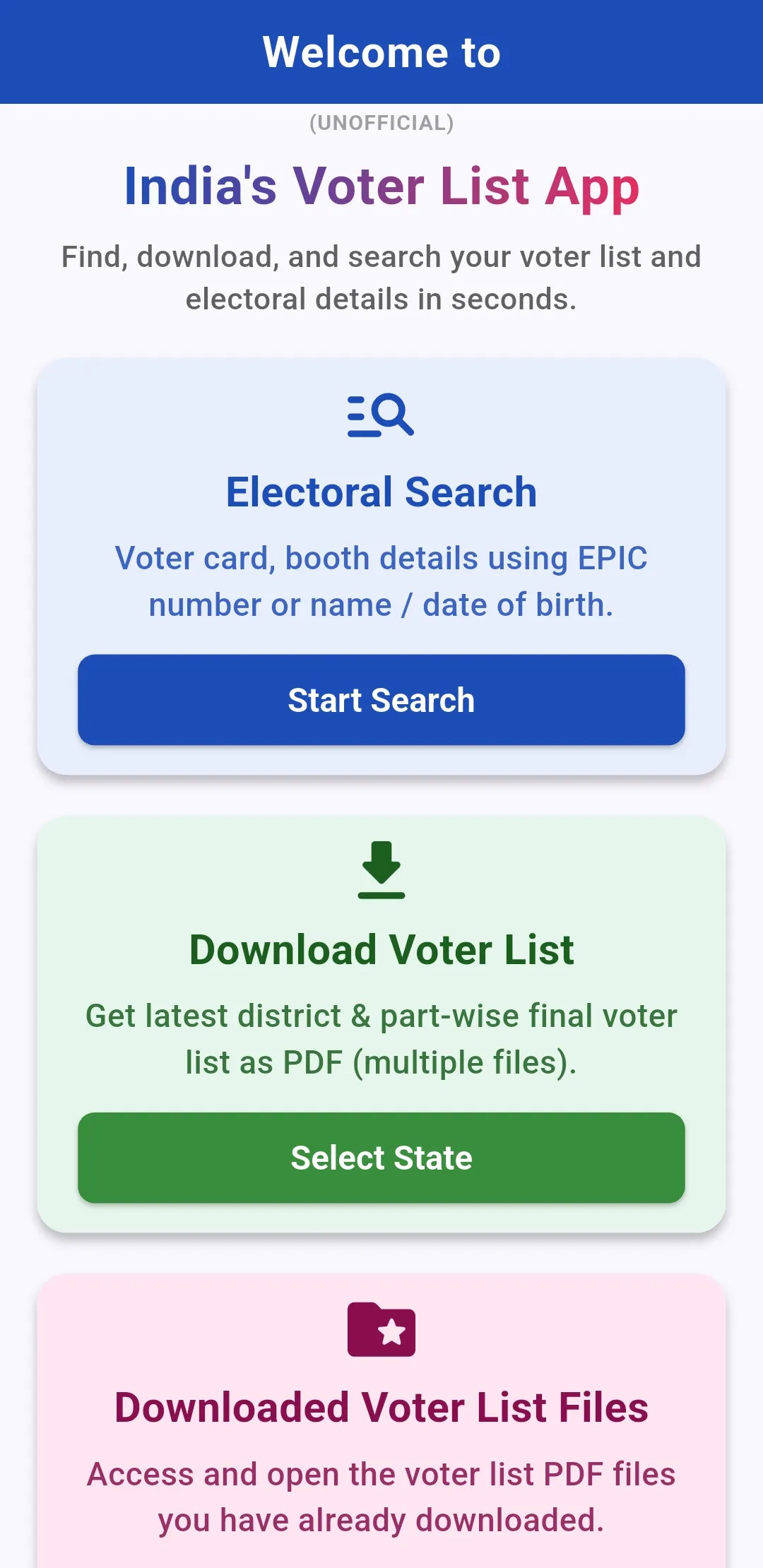 Voter List & Electoral Search App (NOT AN OFFICIAL APP) is your one-stop app to quickly search, view, and download the latest voter lists (electoral rolls) for every state and assembly constituency across India. Get official data directly from the Election Commission of India (ECI) Voters Portal, all in a fast and easy-to-use mobile app. Key Features 1. Search & Download Voter Lists by State, District, and Assembly - Effortlessly choose your State, District, and Assembly Constituency, Part Numbers with a simple, intuitive interface. - Download draft and final voter lists for all States in India like Uttar Pradesh, Maharashtra, West Bengal, Tamil Nadu, Bihar, Rajasthan, Gujarat, and more....